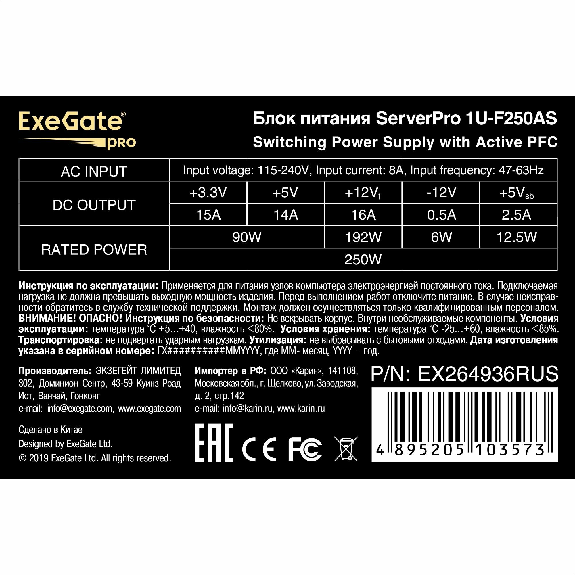 Блок питания Exegate ServerPRO-1U-F250AS 250W (EX264936RUS)