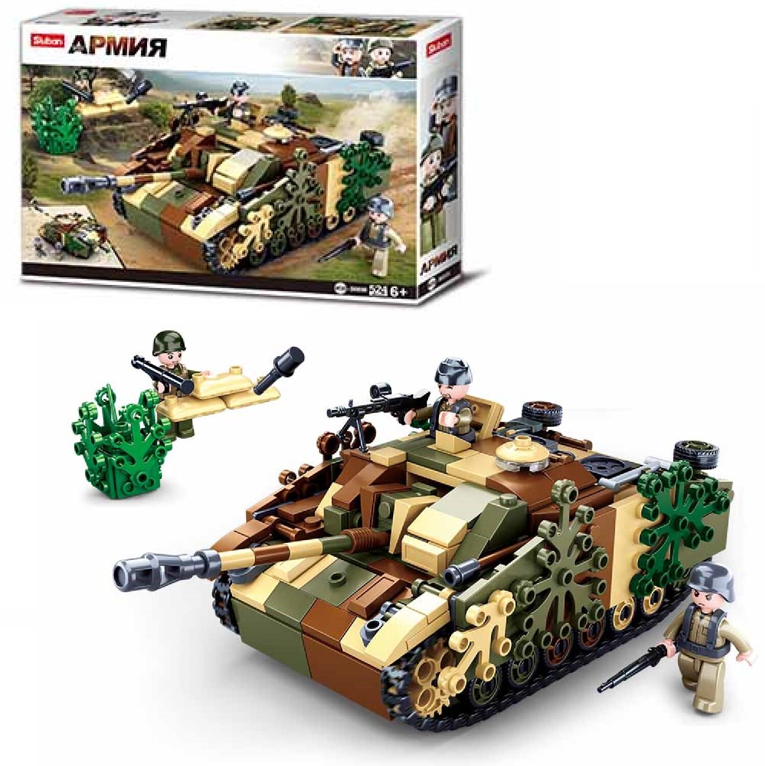Конструктор пластиковый Sluban Армия. Камуфляжный танк (42,5х28,5см,524 дет.,3 фигур.) M38-B0858 ПП-