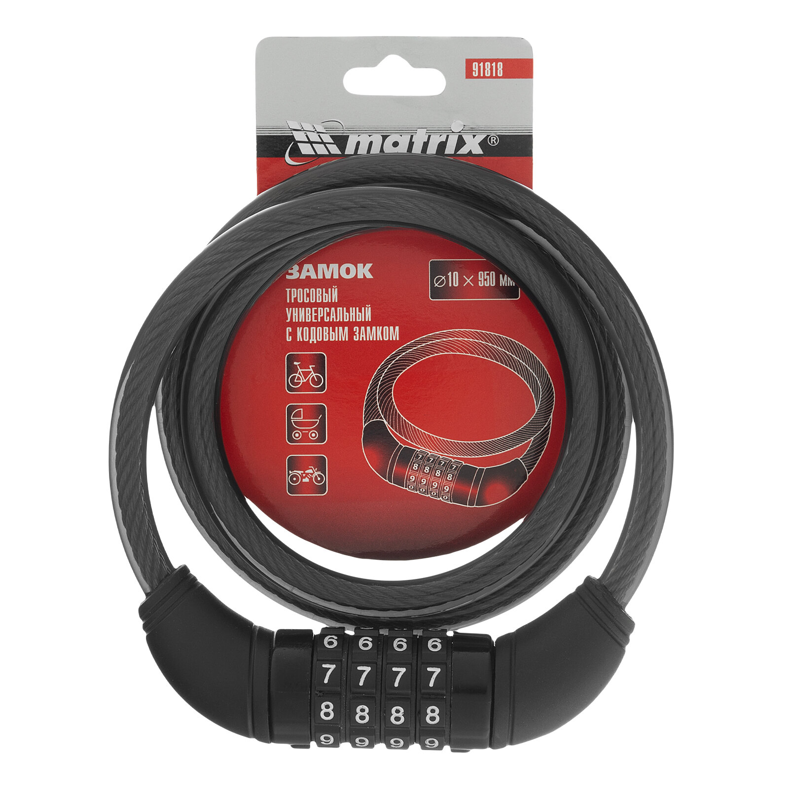 91818 MATRIX Замок тросовый универсальный с кодовым механизмом, 10x950 мм MATRIX 91818 MATRIX 91818