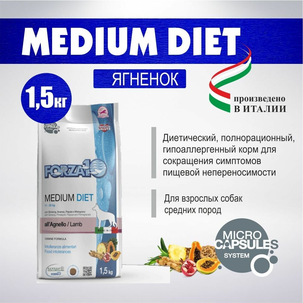 Forza10 Medium Diet сухой корм для взрослых собак средних пород из ягненка с микрокапсулами - 1,5 кг