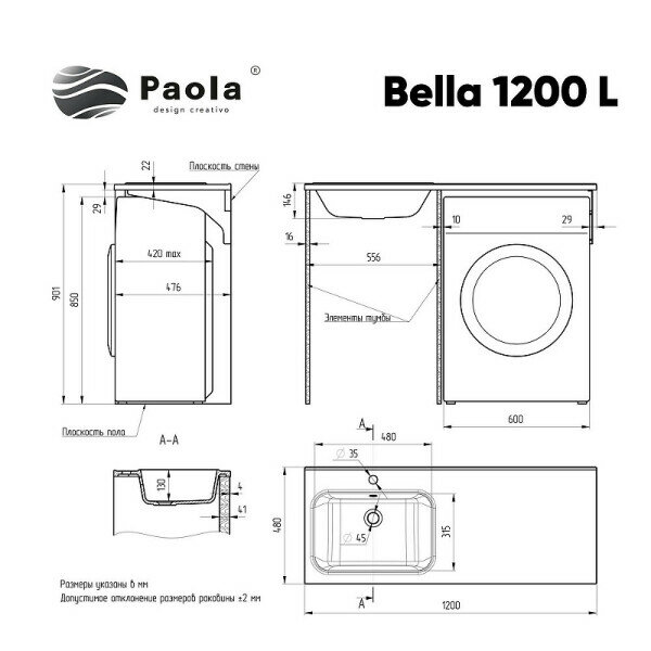 Раковина над стиральной машиной Paola Bella 120 см, левая