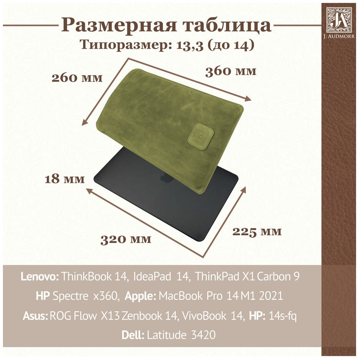 Кожаный чехол - карман J.Audmorr для Macbook 14 Pro (2021) / Ноутбука 13,3"-14", с размерами до 325 х 225 х 18 мм,, зеленый, NewBridge 13.3 Turmalin