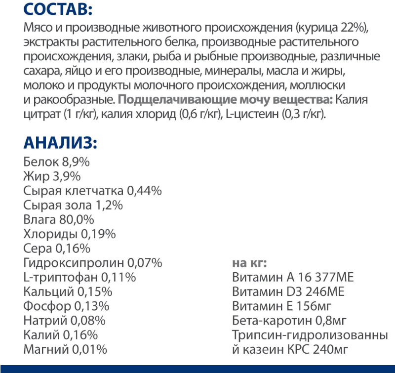 | Состав | мясо и производные животного происхождения, злаки, экстракты растительного белка, рыба и рыбные производные, различные сахара, производные растительного происхождения, яйцо и его производные, минералы, масла и жиры, молоко и продукты молочного происхождения, моллюски и ракообразные. Подкисляющие мочу вещества: DL-метионин, калия хлорид, сульфат кальция, хлорид холина |