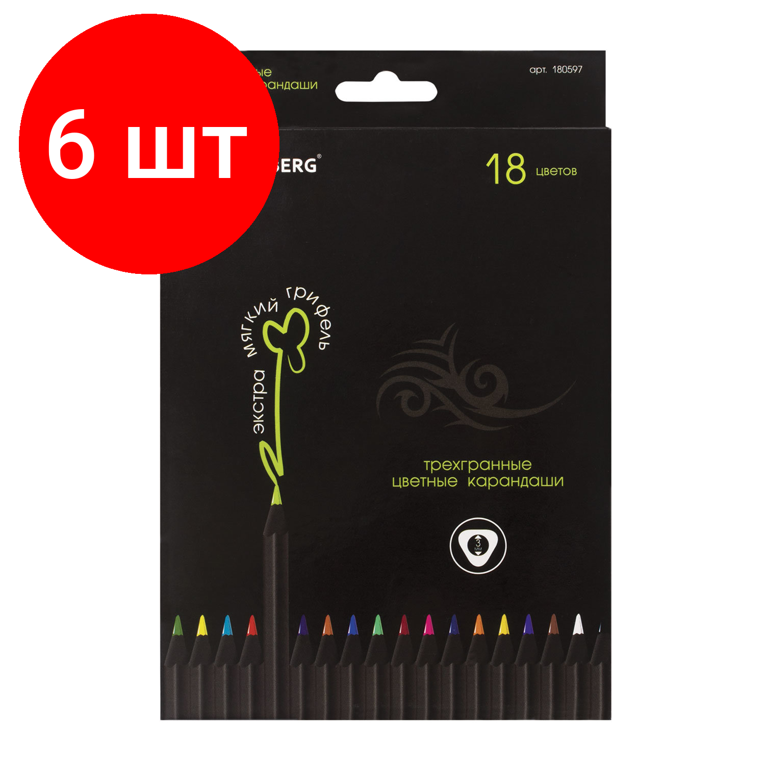 Купить Комплект 6 шт, Карандаши цветные BRAUBERG "Black Jack", 18 цветов, трехгранные, черное дерево, 180597