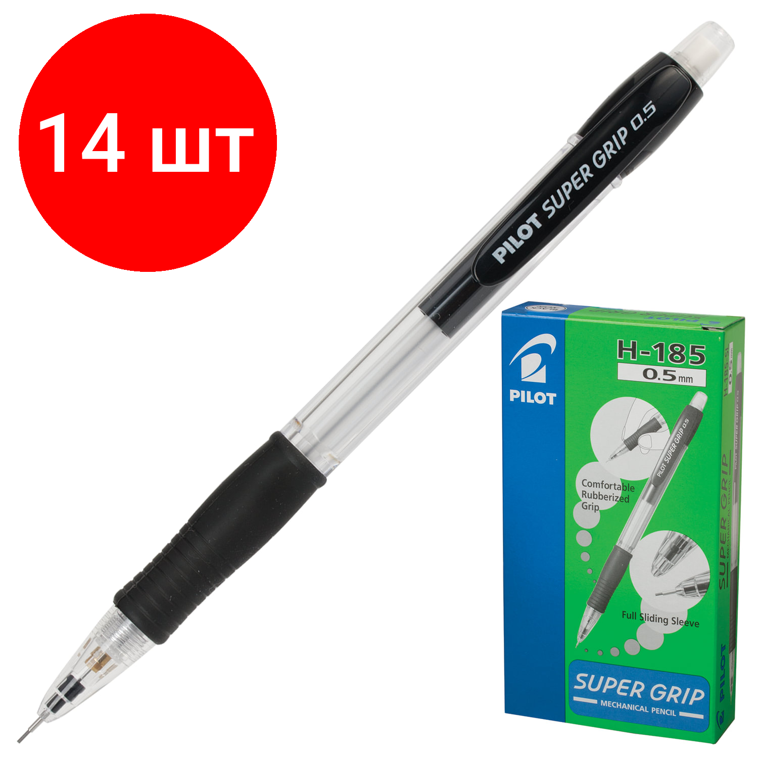 Купить Комплект 14 шт, Карандаш механический 0.5 мм, PILOT H-185 "Super Grip", ластик, резиновый грип, корпус черный, H-185-SL, Н-185