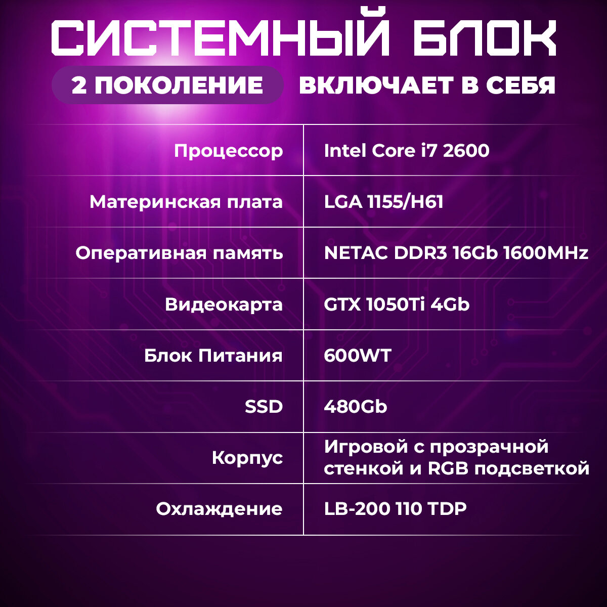 Игровой Компьютер TREIDCOMPUTERS Системный блок с процессором Intel Core I7 - 2600 / 16 Гб DDR3 1600 MHz / SSD 480 gb / GTX 1050 Ti (4 Гб)