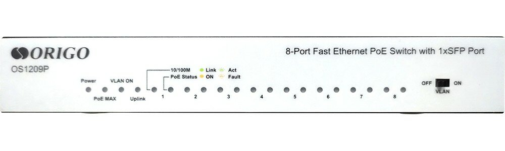 ORIGO Сетевое оборудование OS1209P A1A Неуправляемый PoE-коммутатор 8x100Base-TX PoE+, 1x1000Base-X SFP, PoE-бюджет 80 Вт, корпус металл