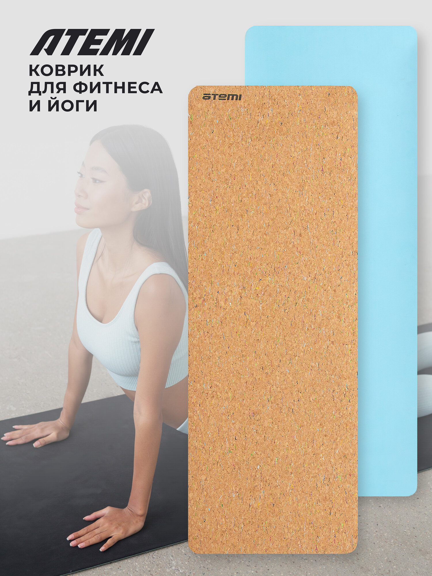 Коврик для йоги и фитнеса Atemi, AYM043, TPE, пробка, 173х61х0,4 см, бирюзовый