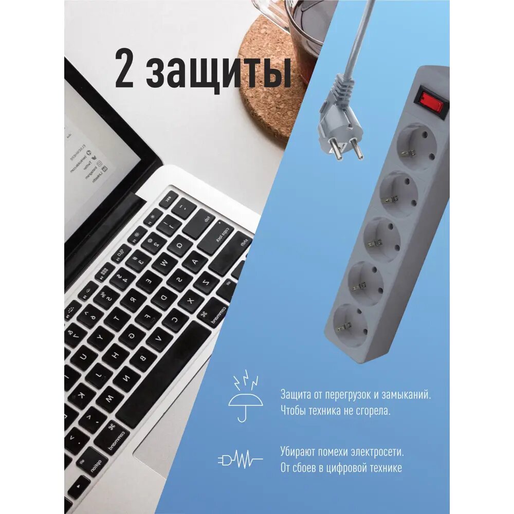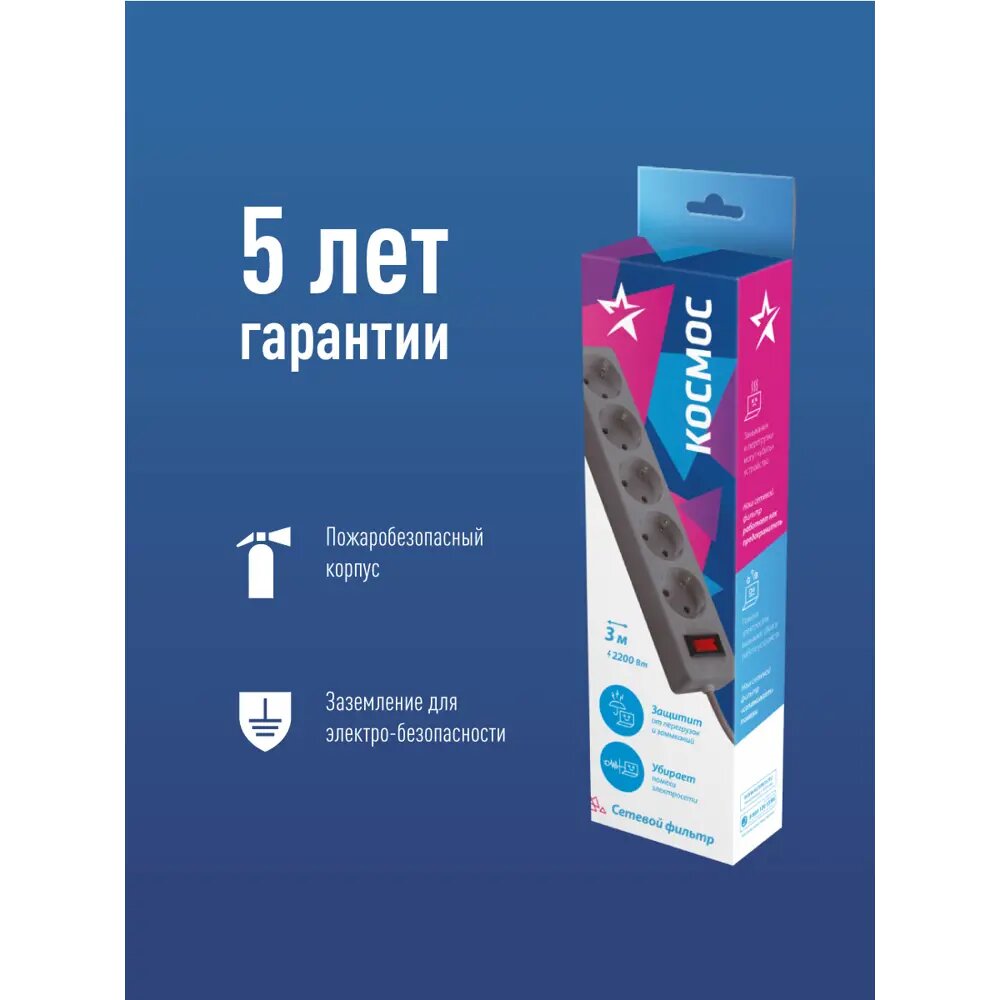 Сетевой фильтр Космос FKsm 5 розеток с заземлением 3x0.75 мм 5 м 2200 Вт цвет серый интересное: