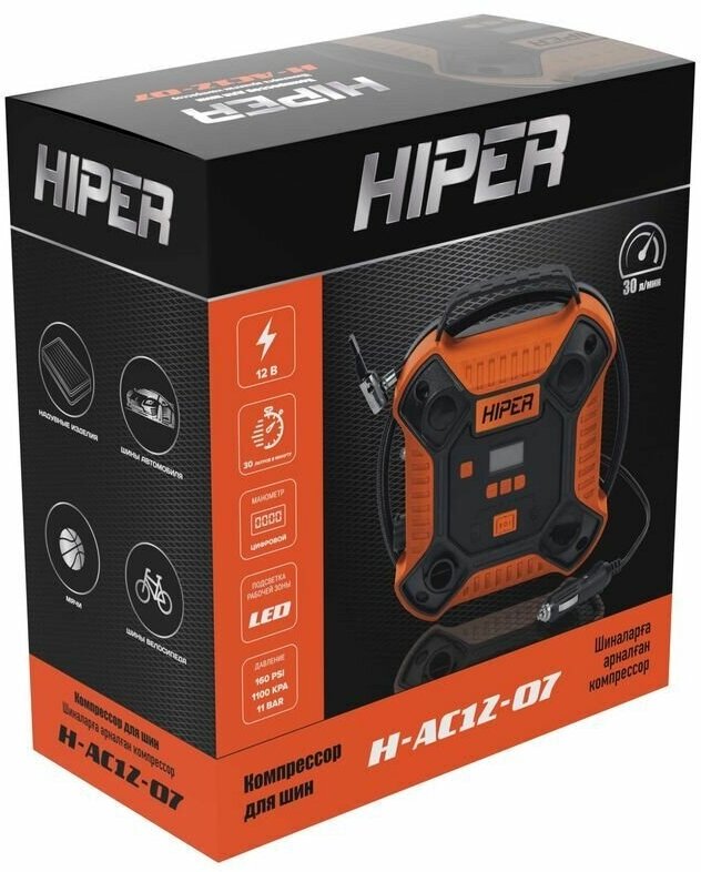 Компрессор автомобильный цифровой HIPER H-AC12-07 / 160 PSI / 1100 Кпа / 11 Атм / 3 м / оранжево-черный