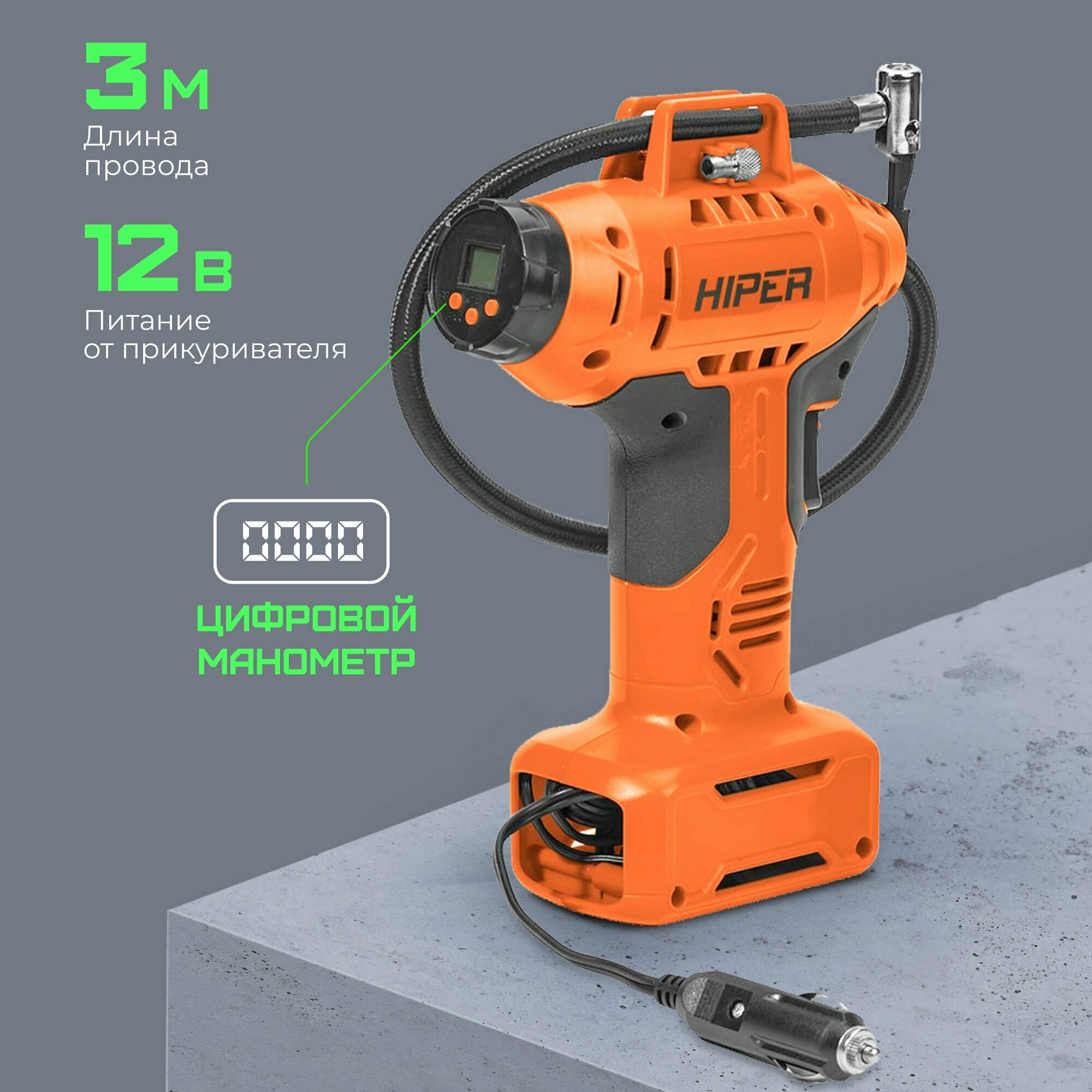 Компрессор автомобильный цифровой HIPER H-AC12-01 / 160 PSI / 1100 Кпа / 11 Атм / 3 м / оранжево-черный