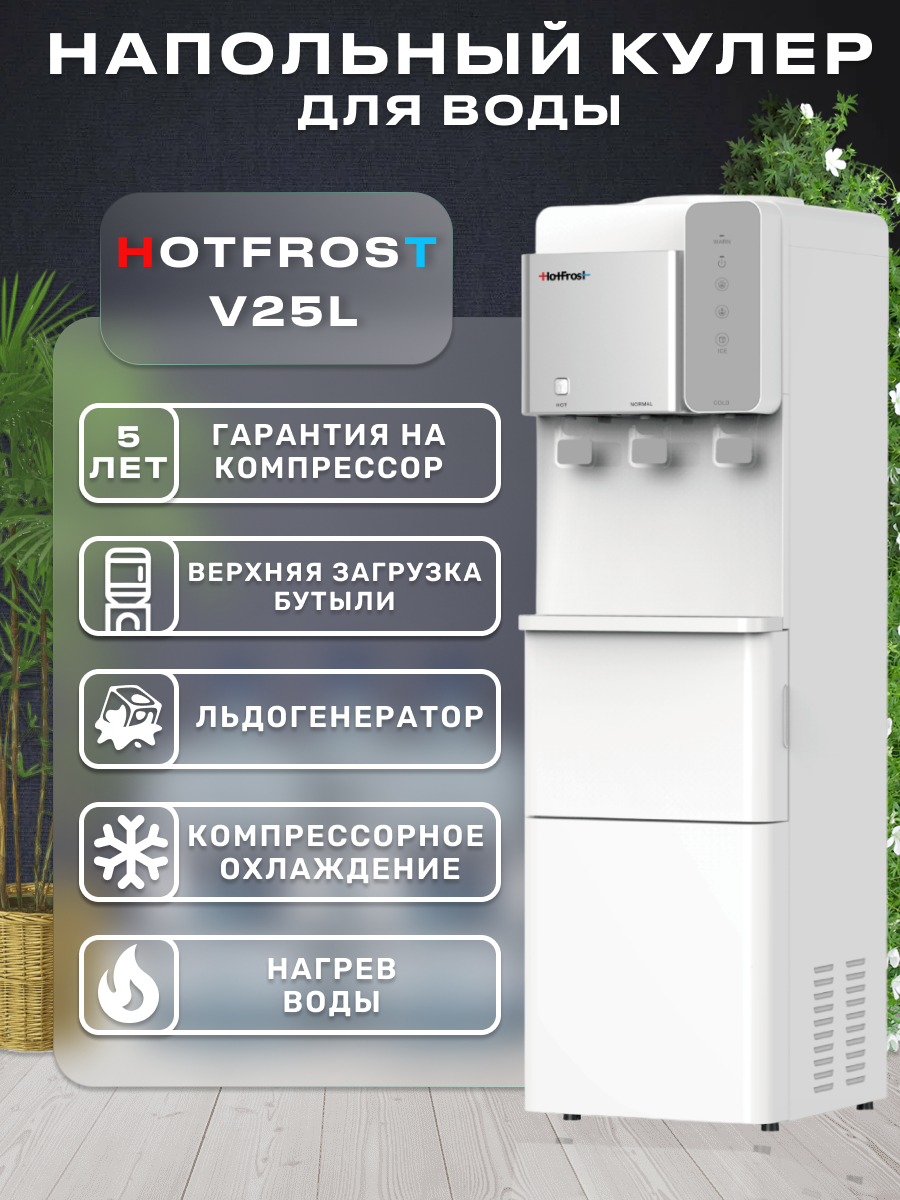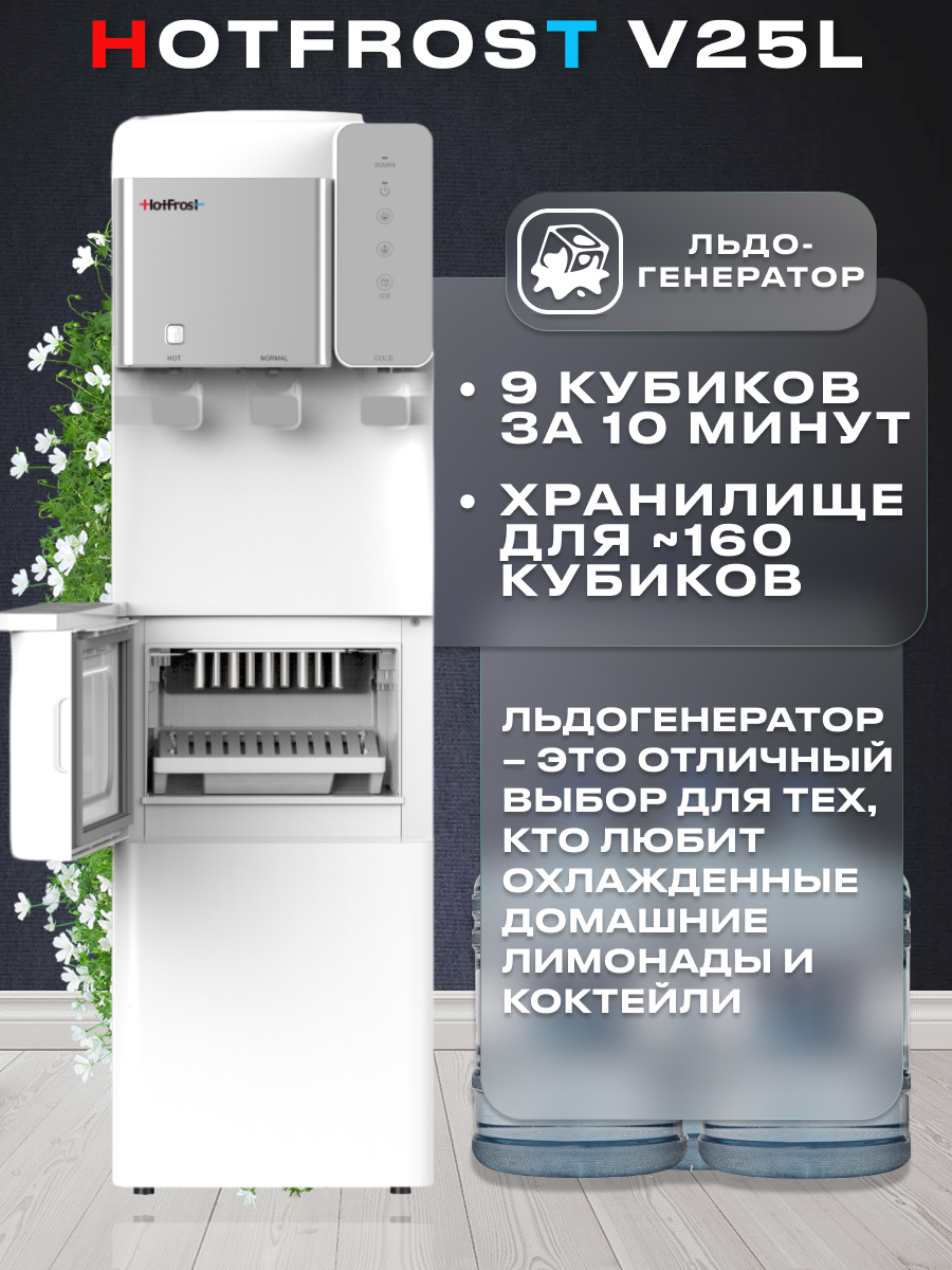 Напольный кулер для воды с льдогенераторном и компрессорным охлаждением и нагревом HotFrost V25L с верхней загрузкой интересное: