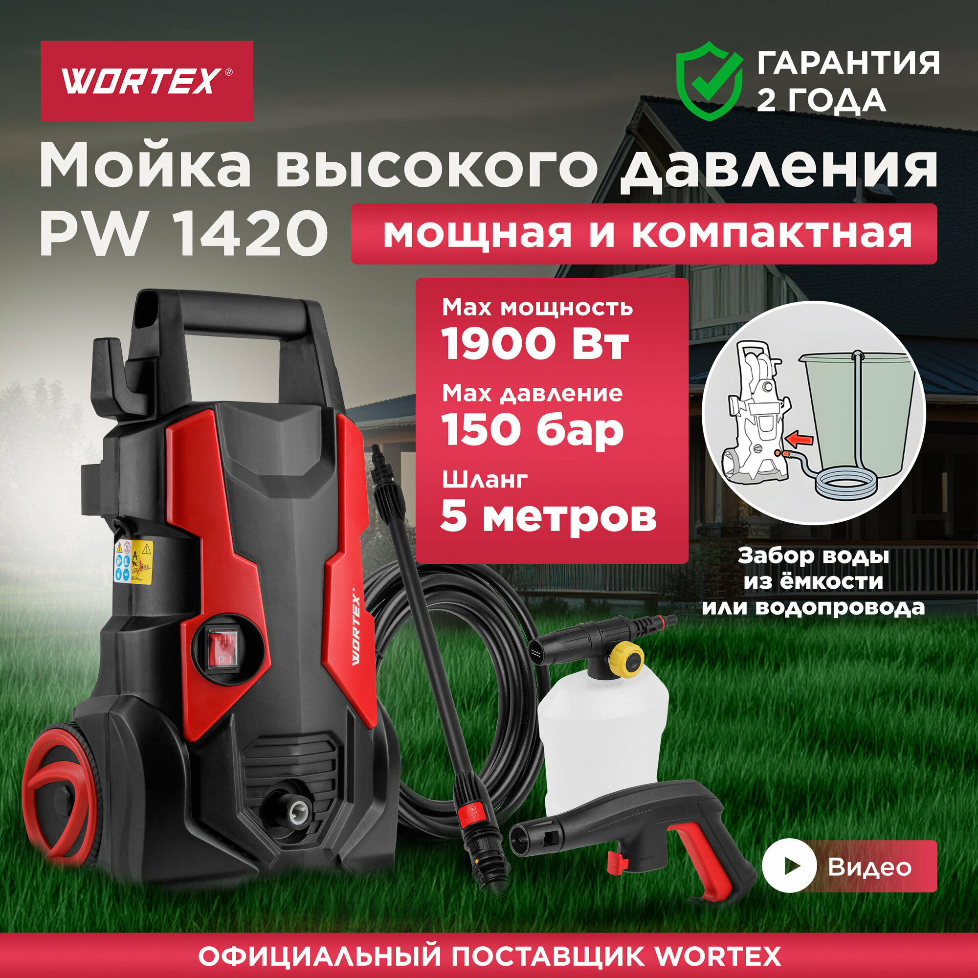 Очиститель высокого давления WORTEX PW 1420 (1.90 кВт, 150 бар, 450 л/ч, ф-ция самовсасывания, мойка высокого давления, автомойка) (0318310)