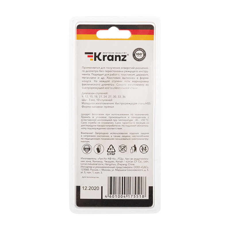 KRANZ Сверло по металлу ступенчатое 9,0-36,0 мм HSS KR-12-6604