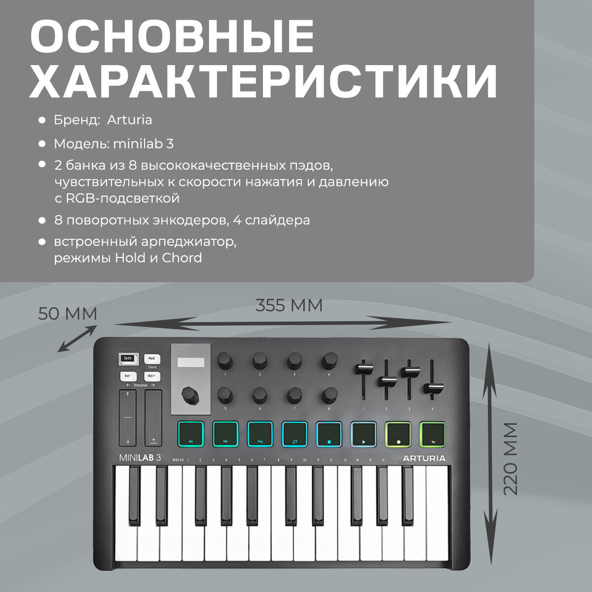 Arturia MiniLAB 3 Deep Black - 25 клавишная MIDI-клавиатура - пэд-контроллер, 9 регуляторов, 8 RGB пэдов, 8 фейдеров, дисплей, сенсорные регуляторы Pitch/Modulation, MIDI-выход, 1/4" Jack вход педали, режим Chord, арпеджиатор, USB-C, ПО