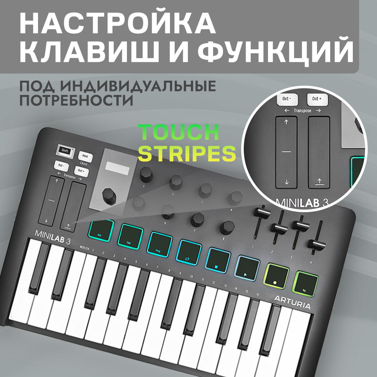 Arturia MiniLAB 3 25 клавишная MIDI-клавиатура - пэд-контроллер, 9 регуляторов, 8 RGB пэдов, 8 фейдеров, дисплей, сенсорные регуляторы Pitch/Modulatio
