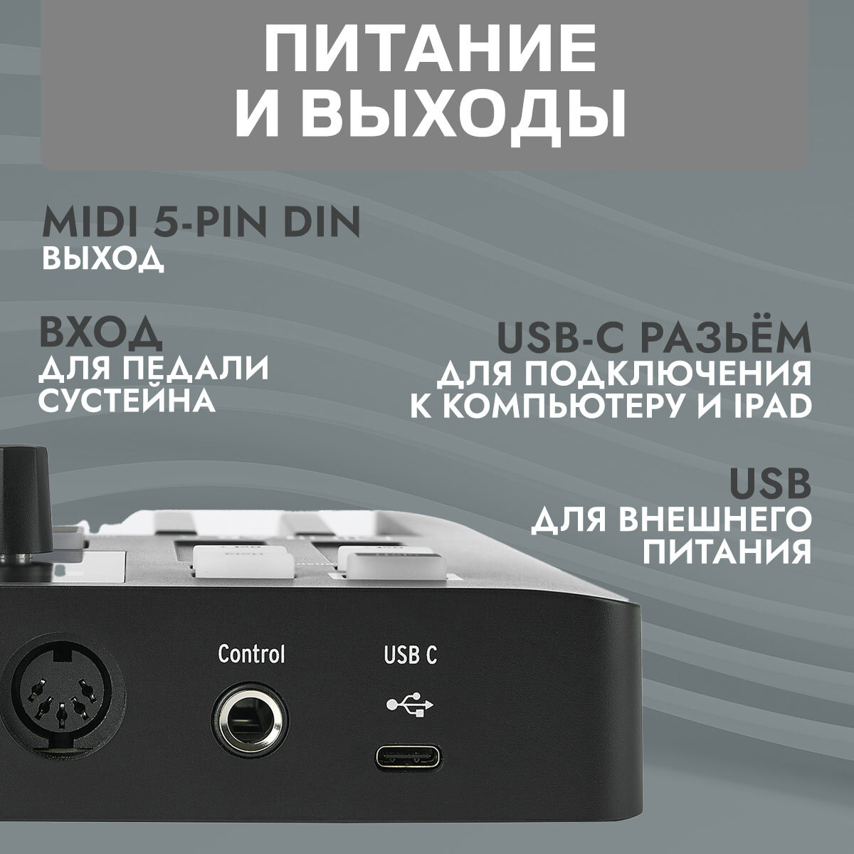 - MIDI выход - Возможность управления трансп - 12 элементов управления (8 энкодеров и 4 фейдера) - Удобный и яркий экран, на котором отображаются приятные анимации при взаимодействии с элементами управления клавиатуры - Приятные на ощупь кнопки и велосити чувствительные пэды. - режим арпеджиатора и возможность транспонирования. - Качественный USB-C - USB кабель. |