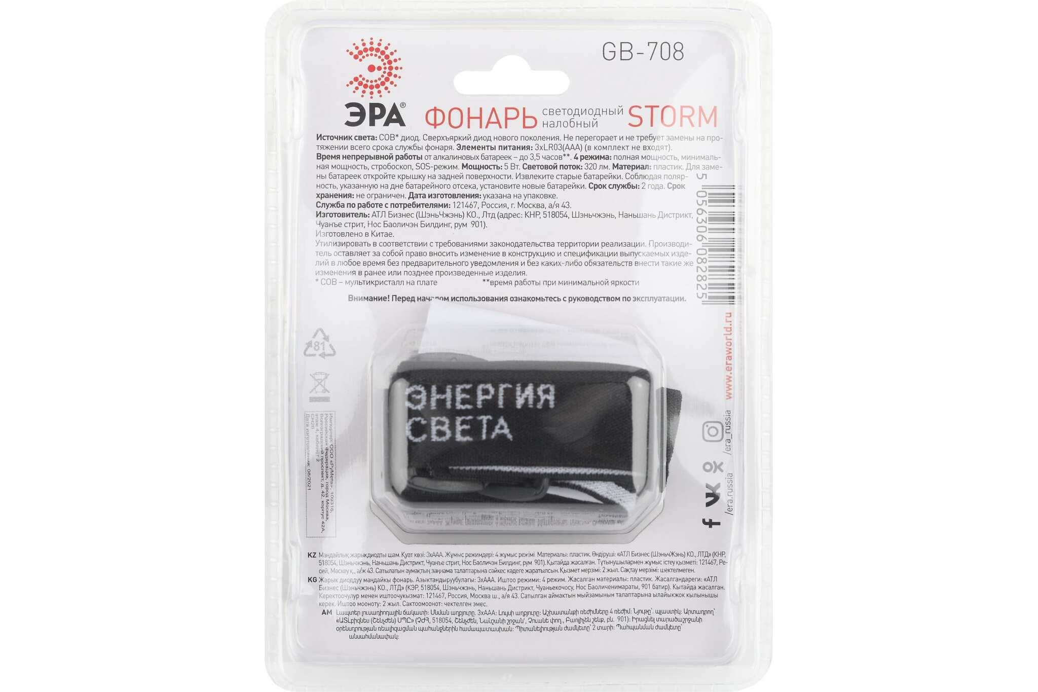 Фонарь налобный на батарейках GB-708 Шторм ЭРА мощный туристический / Фонарик кемпинговый светодиодный ударопрочный, 4 режима, аварийное мигание