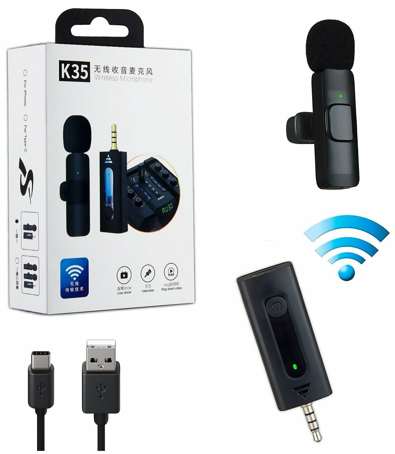2в1 Петличные микрофоны беспроводные 3.5mm AUX K35 (2 беспроводных микрофона петлички с приемником аукс 3,5мм) интересное: