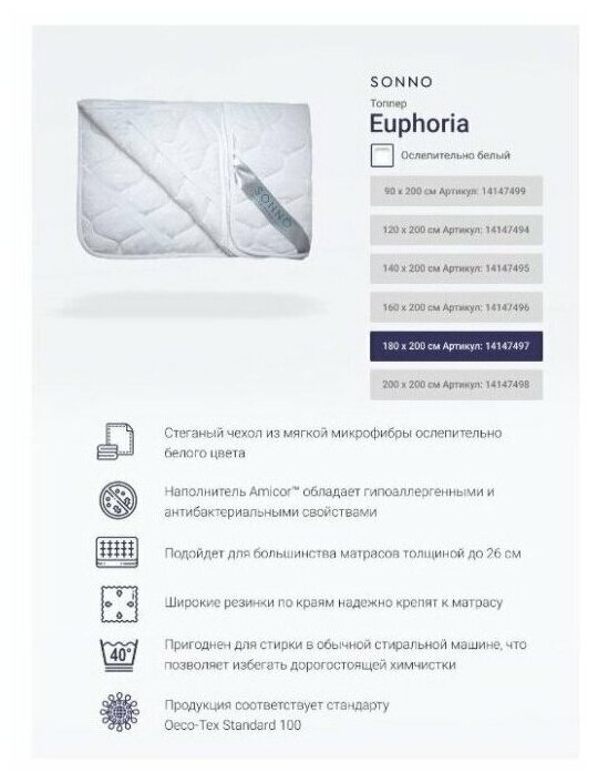 Купить Наматрасник-топпер, чехол на матрас SONNO EUPHORIA, гипоаллергенный, защитный, стеганый, с резинками по углам, 180х200 см