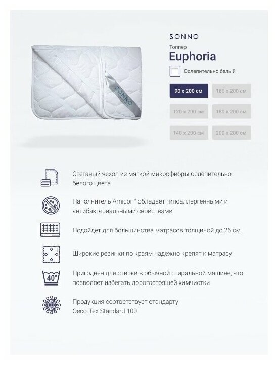 Купить Наматрасник-топпер, чехол на матрас SONNO EUPHORIA, гипоаллергенный, защитный, стеганый, с резинками по углам, 90х200 см