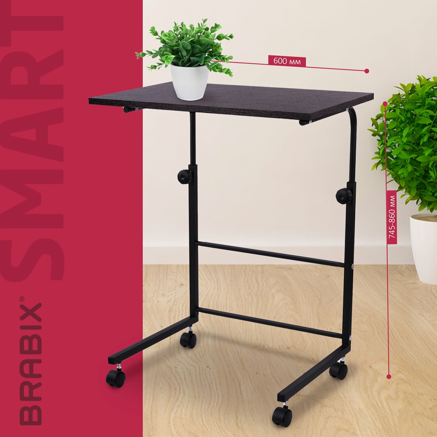 Стол BRABIX "Smart CD-013", 600х420х745-860 мм, лофт, регулируемый, колеса, металл/ЛДСП ясень, каркас черный, 641883