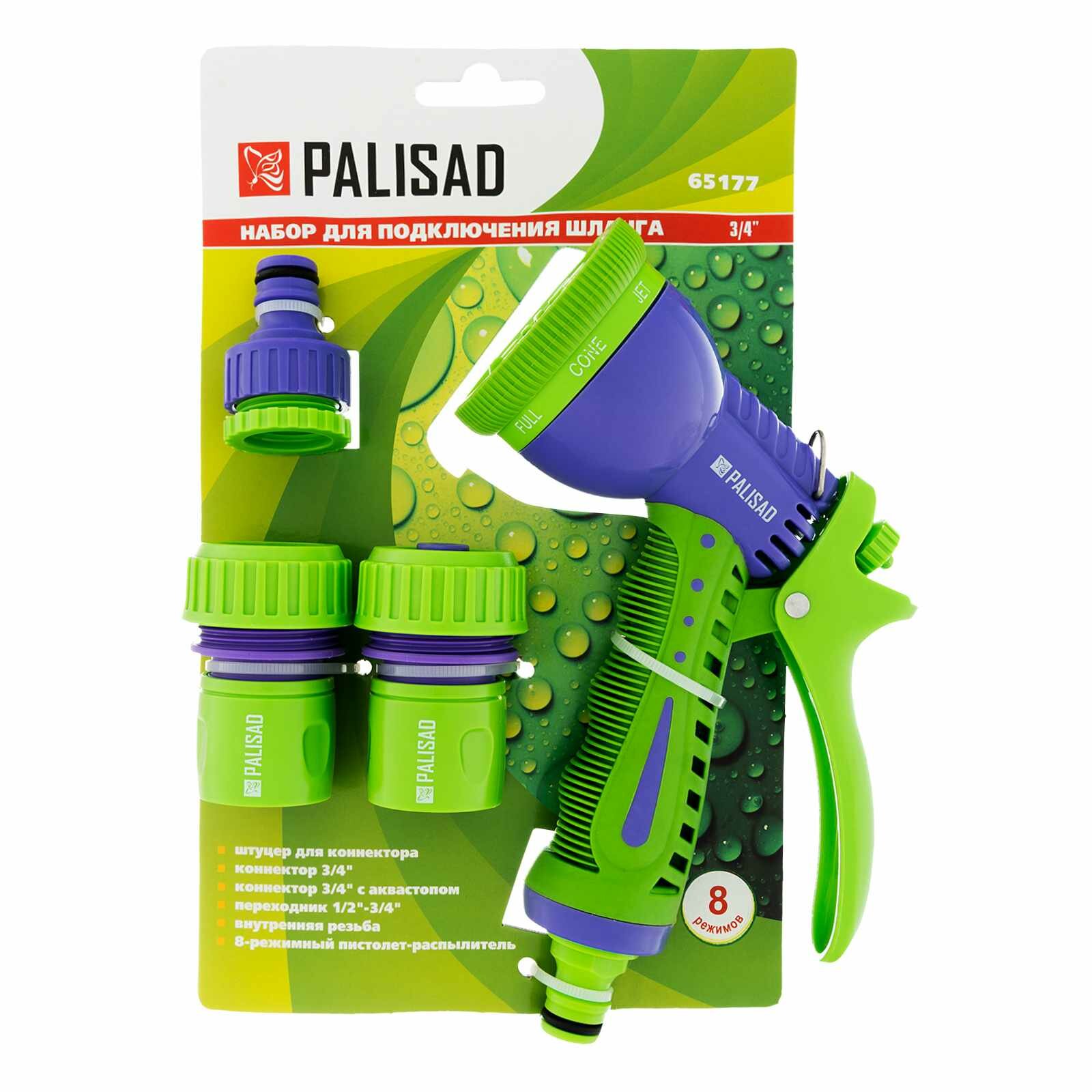 Набор для подключения шланга 3/4, пистолет 8 режимов полива, адаптер, 2 соединителя Palisad, 65177
