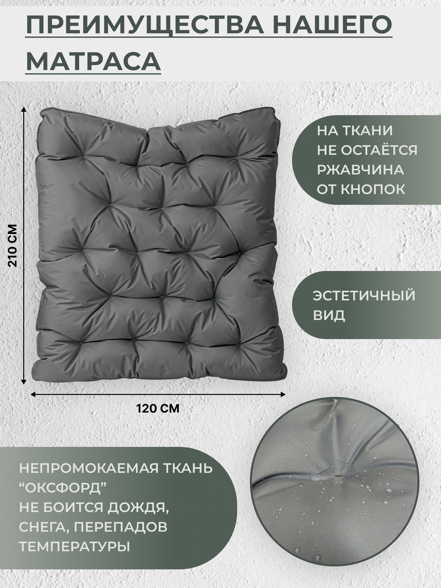| Отзыв: | Грандиозное сооружение, хотела заказать больше, но хорошо, что не заказала, двое подвисных кресел на веранде думаю будут смотреться шикарно! Матрас по толщине то, что надо, мощный и пружинистый, начинки не пожелели! Ткань плотная, но наматрасник не сьемный, хорошо задекорирован прострочкой по всему матрасу! |