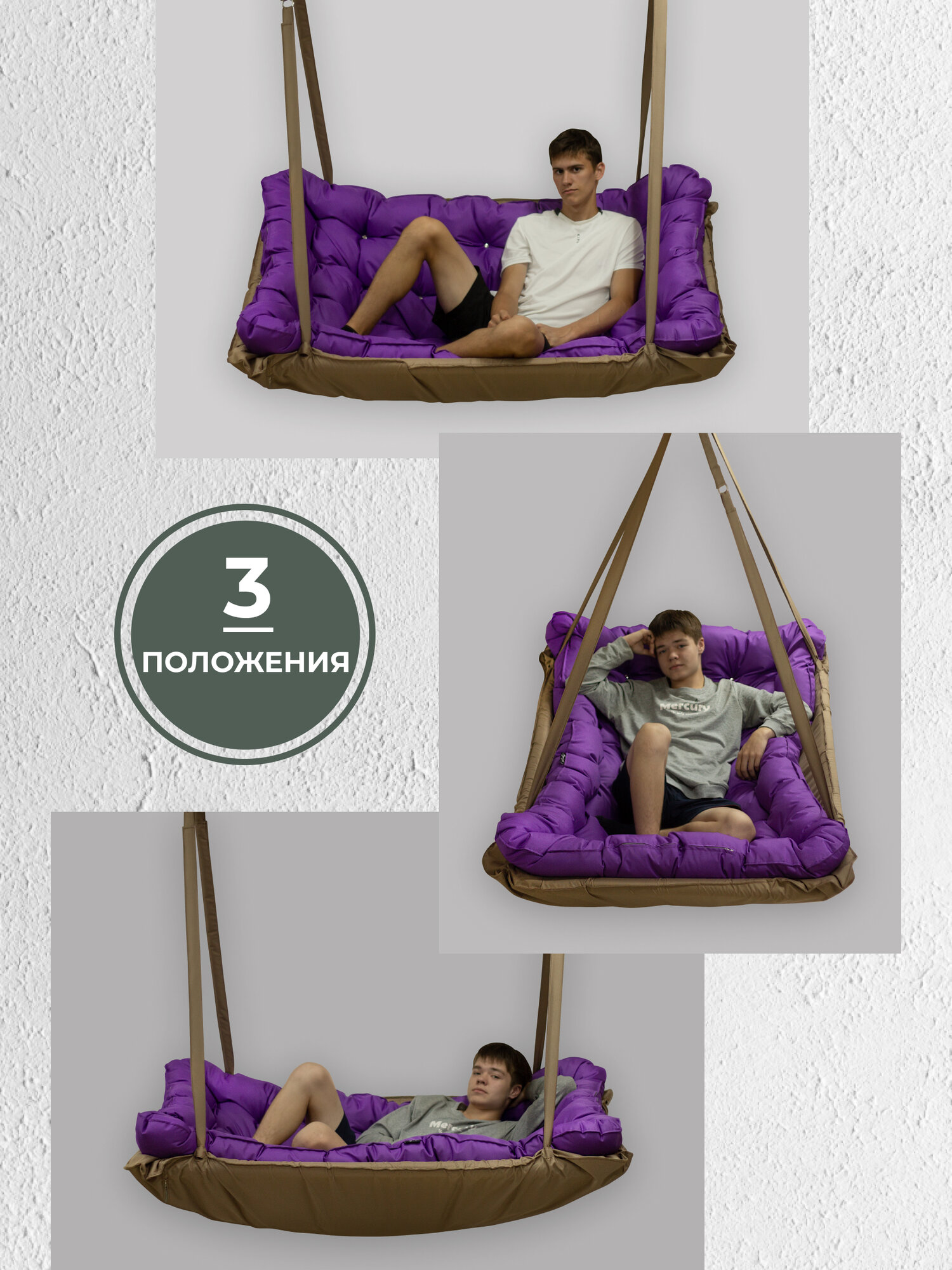 Купить Подвесные качели, качели садовые, диван 150*100, качели для дачи, уличные качели, качель бежевая с фиолетовой подушкой
