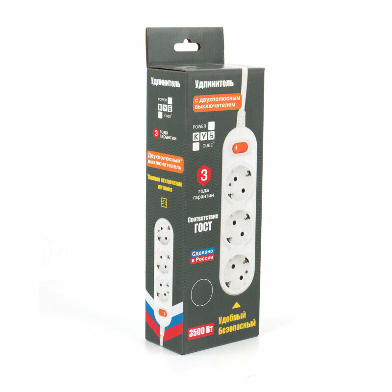 Купить PowerCube Удлинитель (pc-1-3м) 3.0м, 3 розетки, 16А, с выключателем, белый