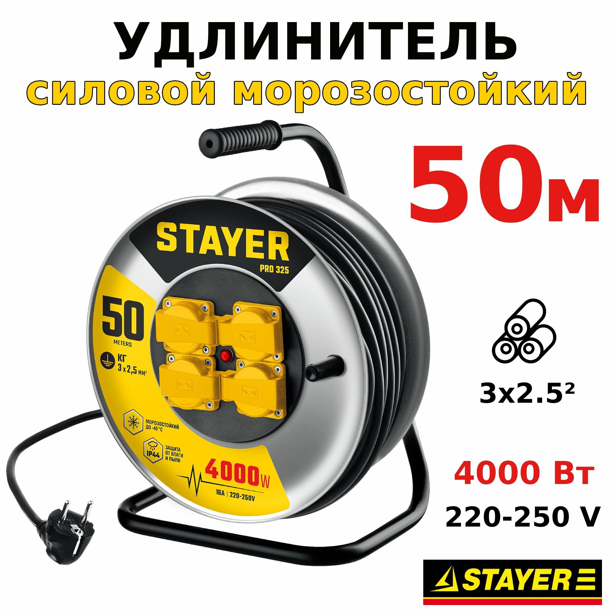STAYER PRO-325, КГ, 3 х 2.5 мм2, 50 м, 4000 Вт, IP44, силовой удлинитель на стальной катушке (55076-50)