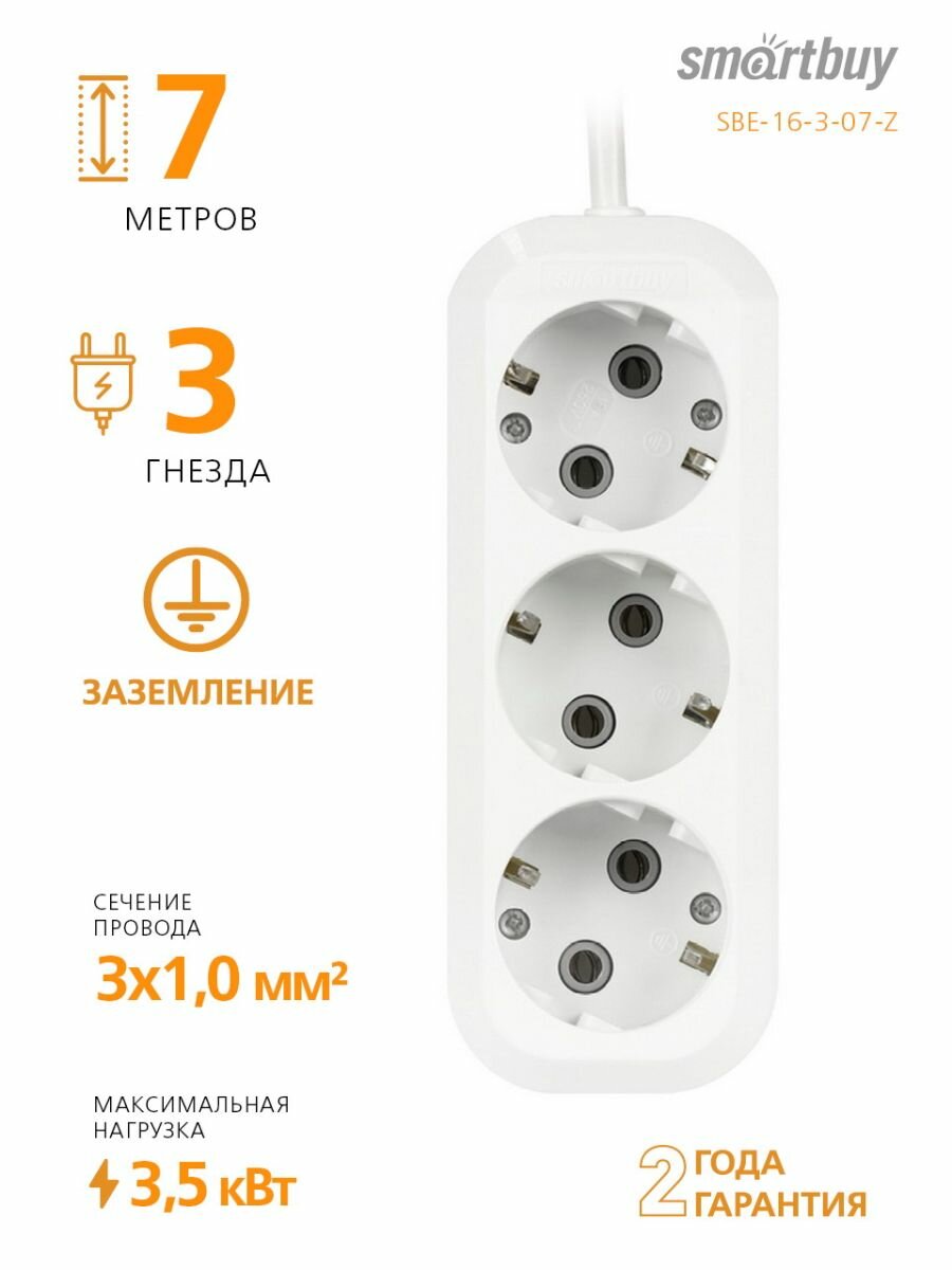 Удлинитель Smartbuy, 3 гнезда 7 метров 16А/3,5кВт с заземлением ПВС 3х1,0