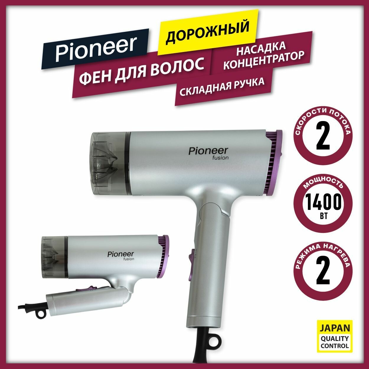 "Фен складной Pioneer с турмаливой ионизацией и инновационным концентратором, 2 скорости, 2 режима нагрева, керамическая решетка, 1400 Вт "