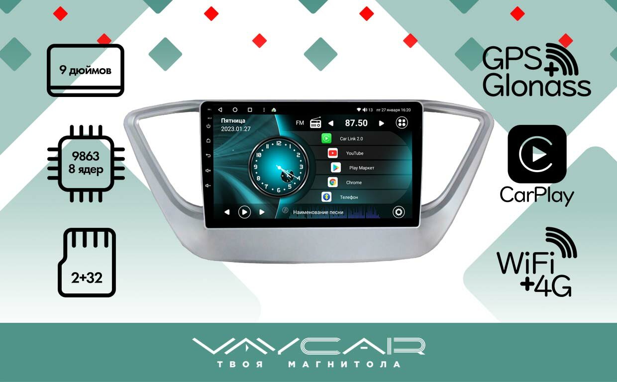 Магнитола Vaycar 09V2 для HYUNDAI Solaris 2017+ (Андроид, 2+32, 8 ядер, WiFi, BT, 4G, GPS, QLED 9")