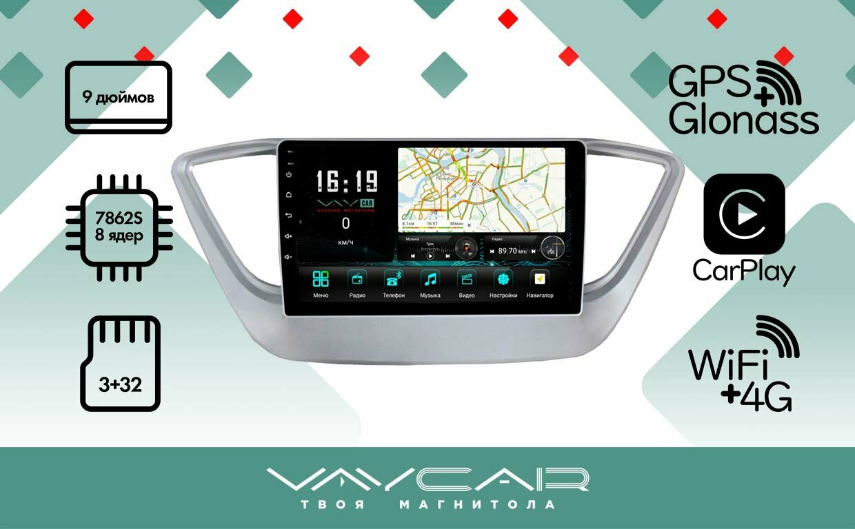 Магнитола Vaycar 09V2 для HYUNDAI Solaris 2017+ (Андроид, 2+32, 8 ядер, WiFi, BT, 4G, GPS, QLED 9")