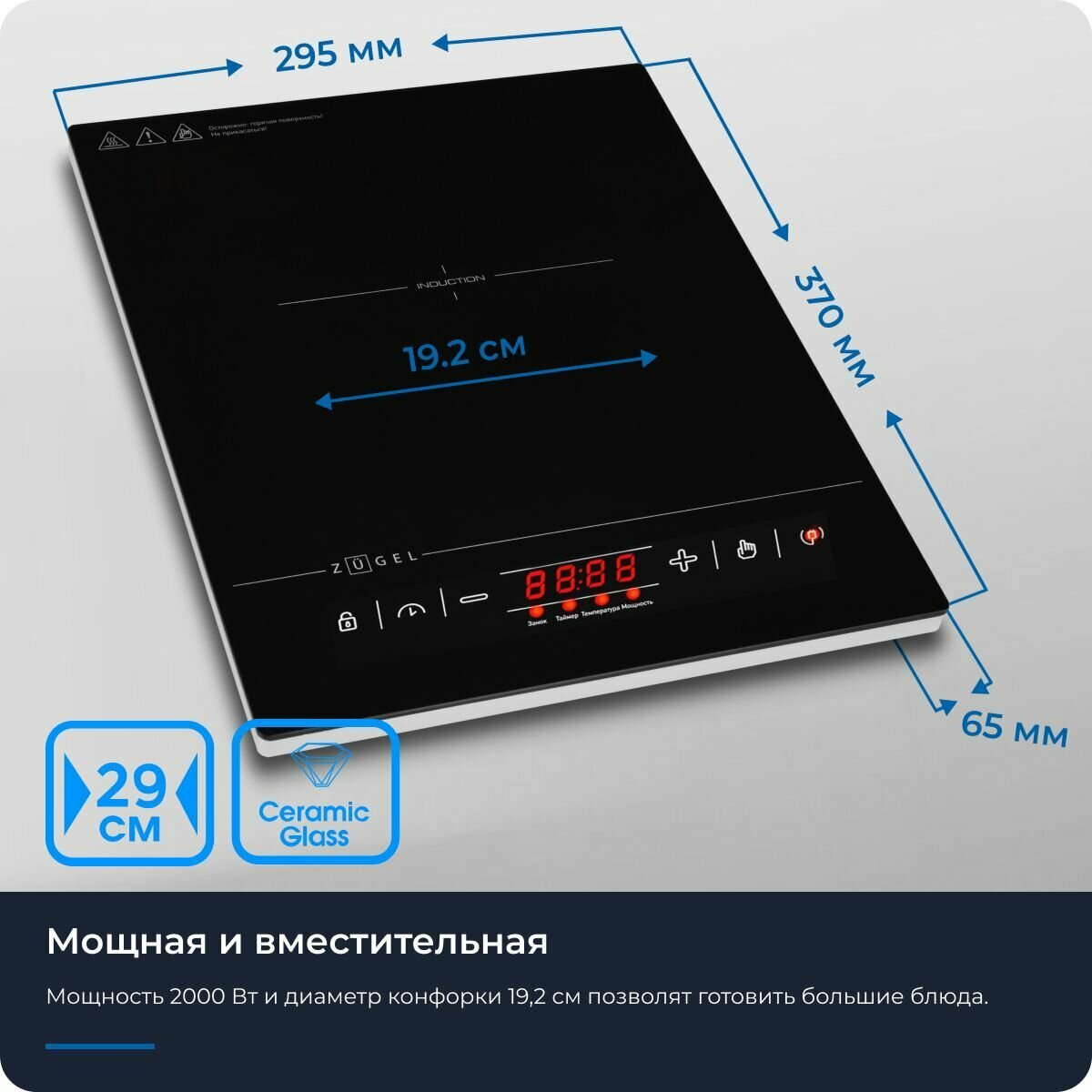 Индукционная плитка настольная ZUGEL ZIHF61B, 2000 Вт, стеклокерамика, сенсорное управление, защита от детей, быстрый нагрев, таймер, дисплей, черный интересное: