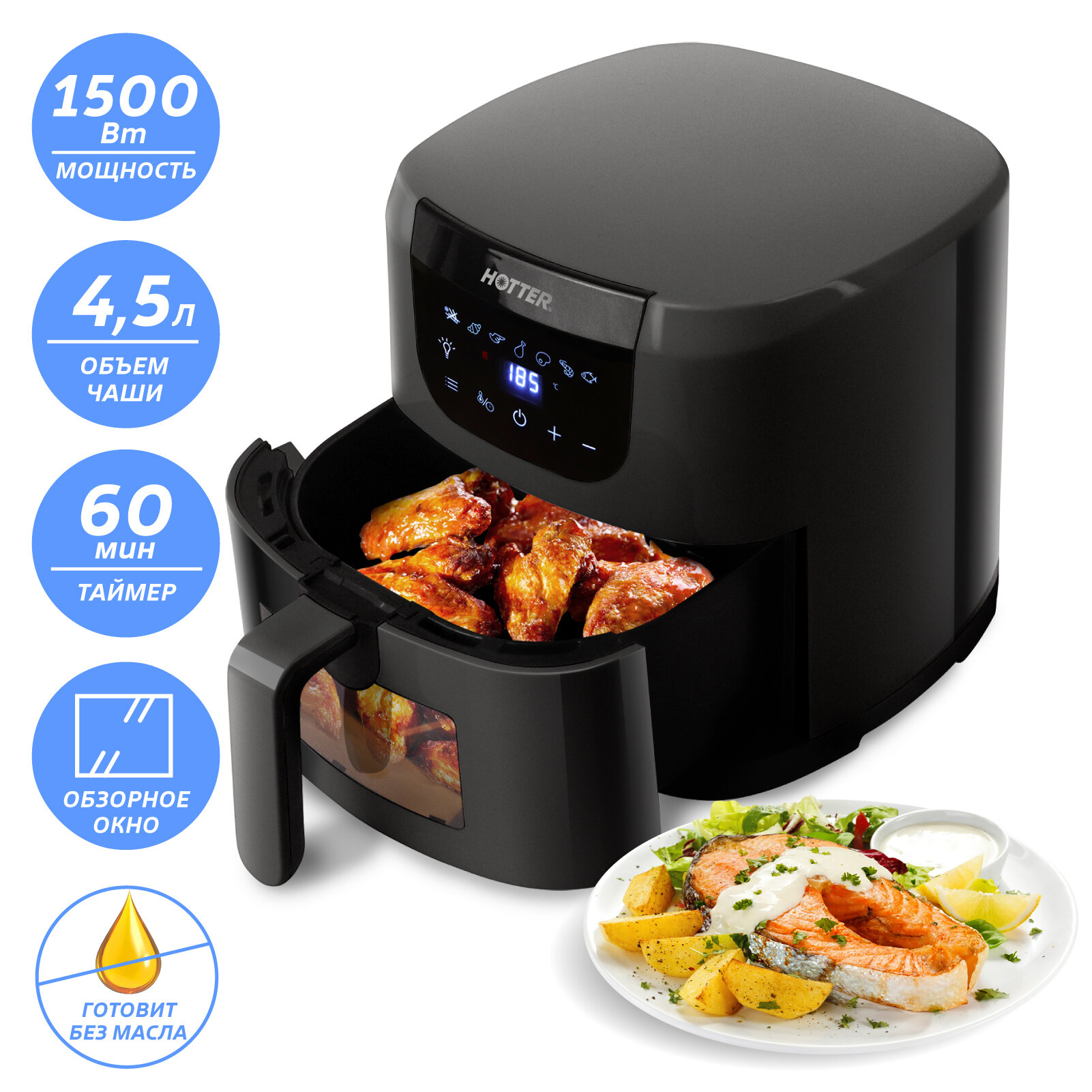 Купить Аэрогриль HOTTER HX-588 черный ,7 автопрограмм и регулировка времени и температуры, с обзорным окном, объем 4.5л, 1,5 кВт