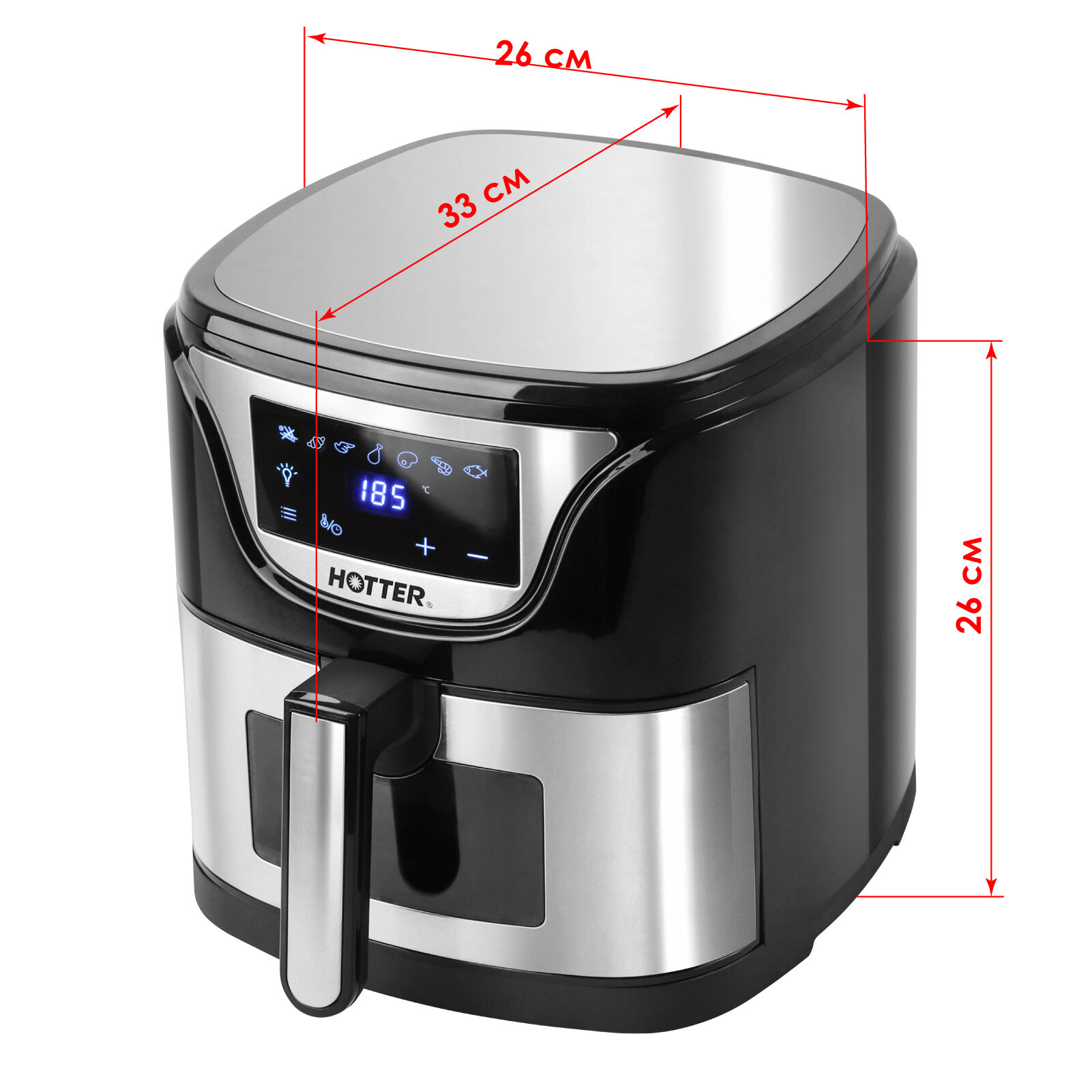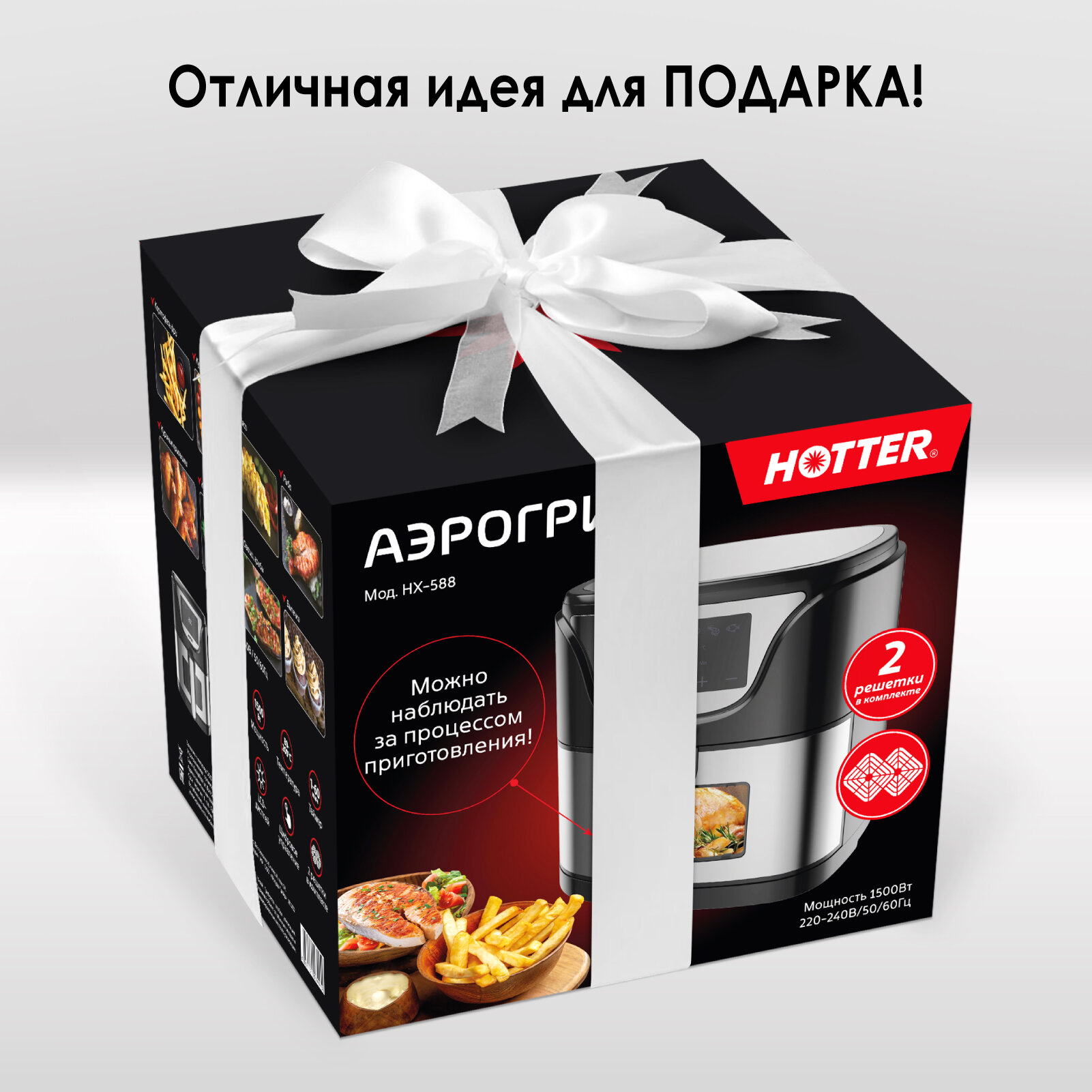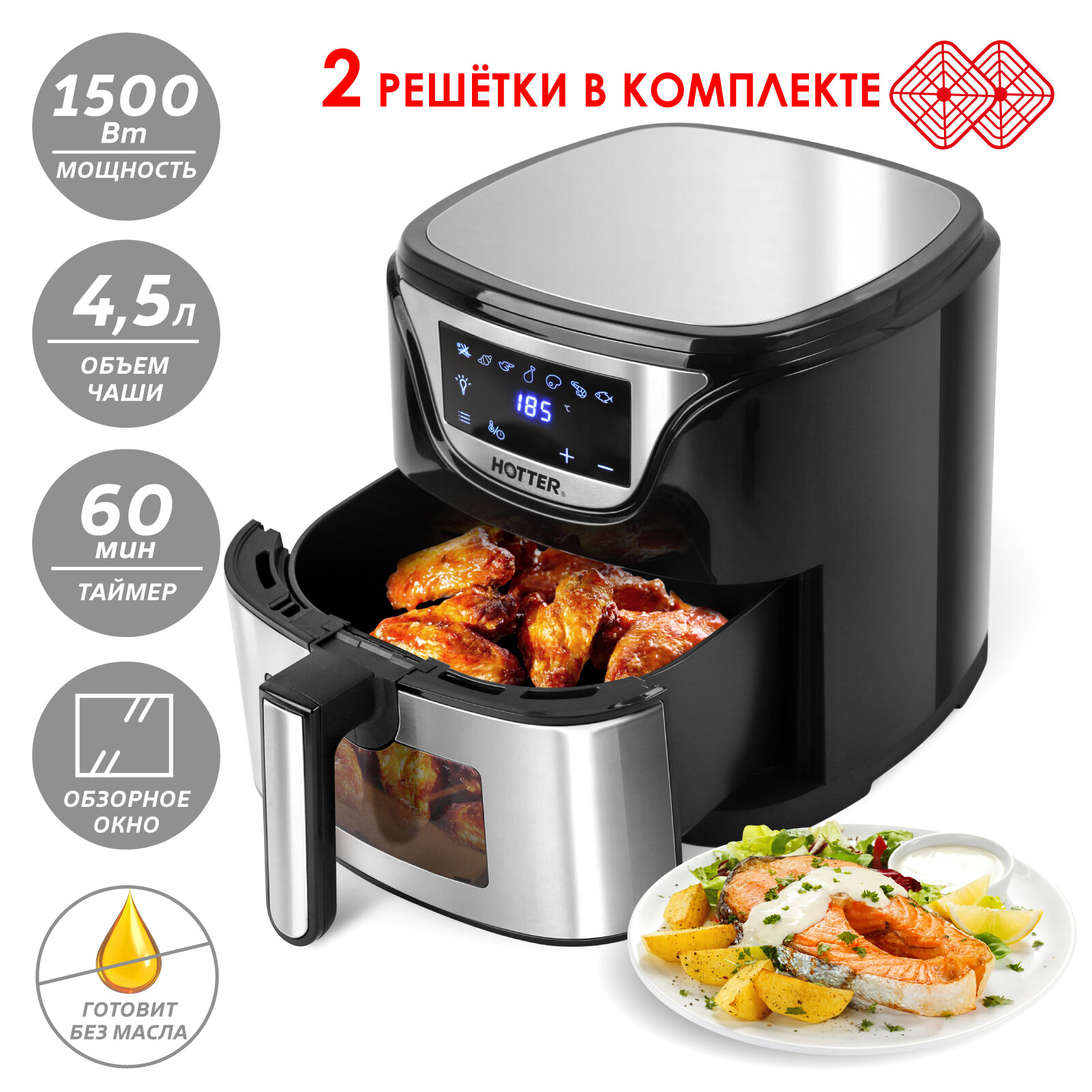 Аэрогриль HOTTER HX-588 черный/ металлик, 7 автопрограмм и регулировка времени и температуры, обзорное окно, объем 4.5л, 1500Вт интересное: