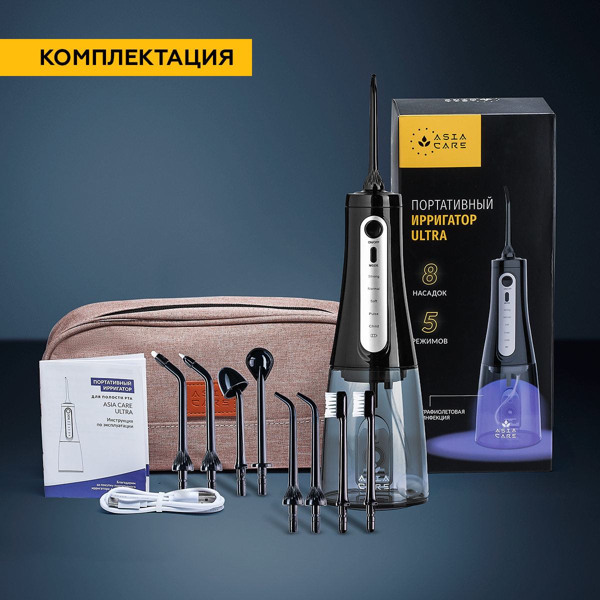 Ирригатор для полости рта портативный Asia Care PRO, 14 насадок, прибор для чистки брекетов, языка, коронок, имплантов, черный