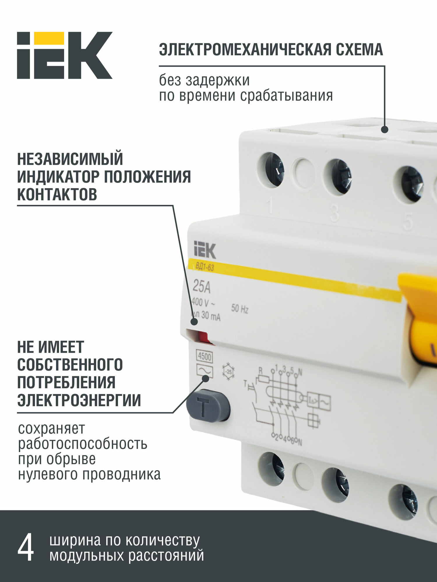 УЗО IEK ВД1-63 (MDV10-4-025-030) 25А 30 мА 4P тип АС 4,5 кА