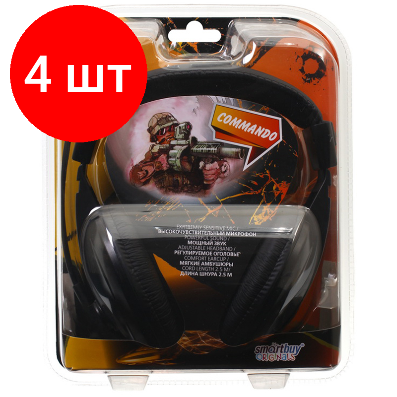 Купить Комплект 4 шт, Наушники с микрофоном Smartbuy Commando, с регулятором громкости, 2.5м, черный