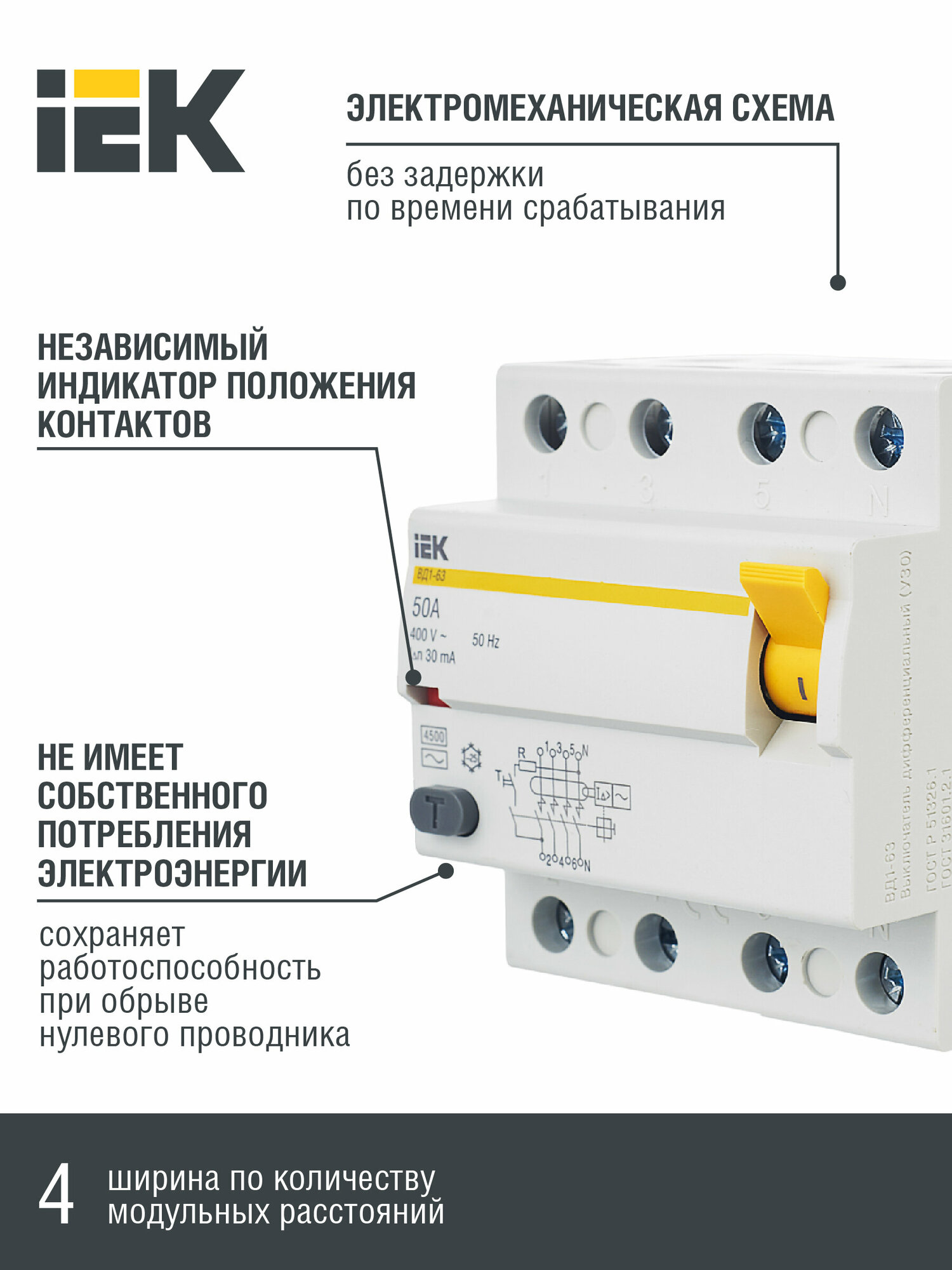 Дифференциальный выключатель нагрузки УЗО ВД1-63 4 полюса, 50А, Тип AC, 30мА MDV10-4-050-030 IEK