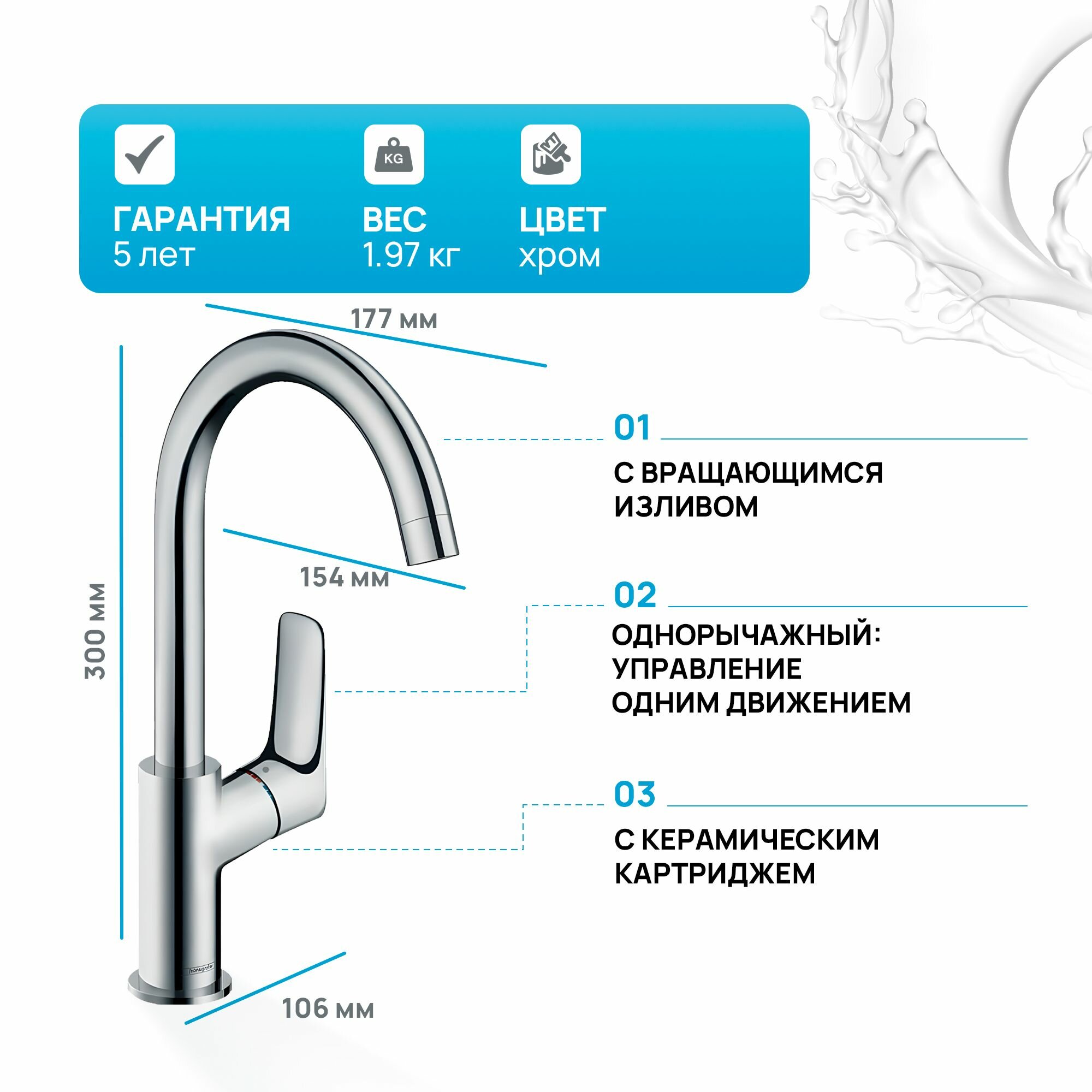 Смеситель для раковины hansgrohe Logis 71131000 с поворотным изливом без сливного набора, хром