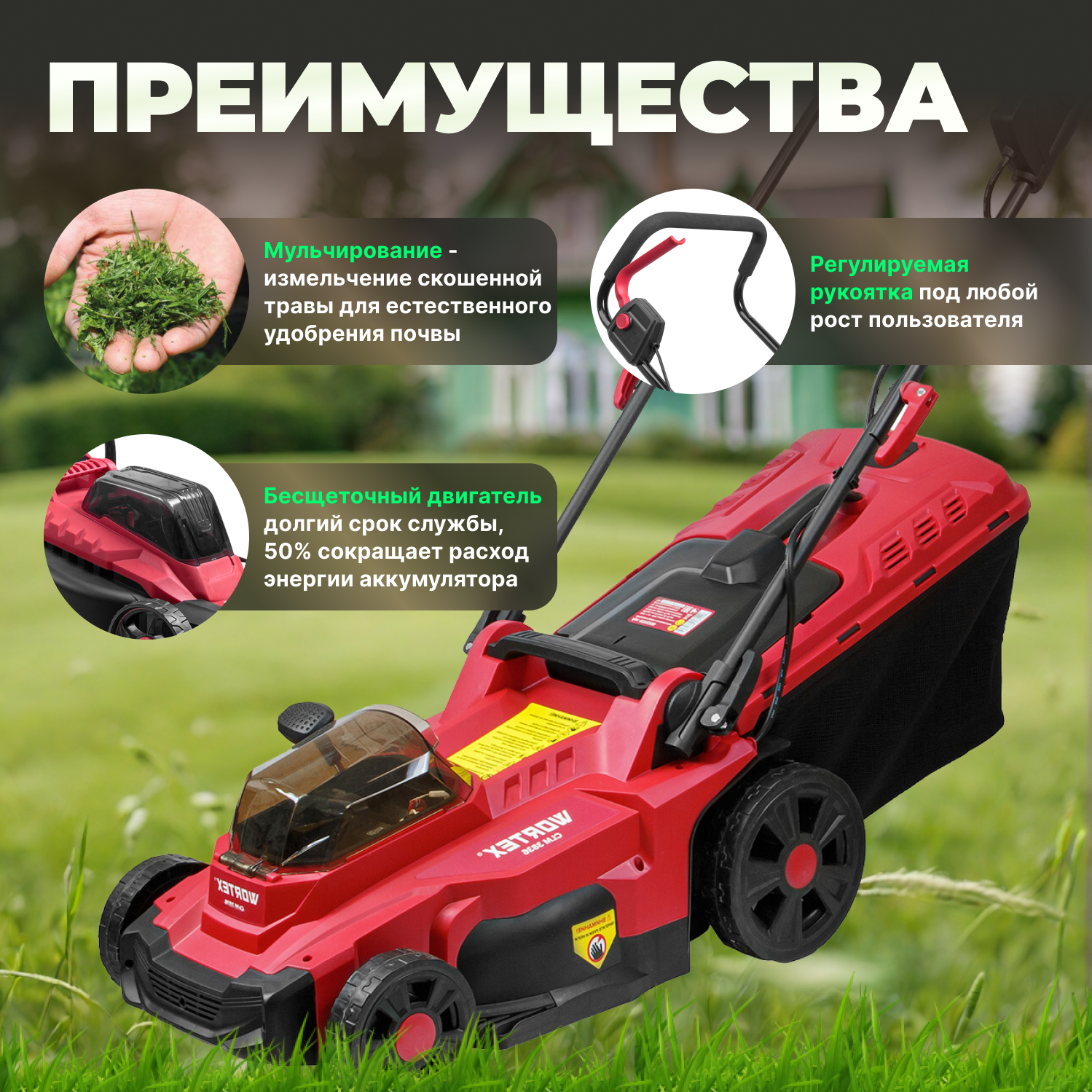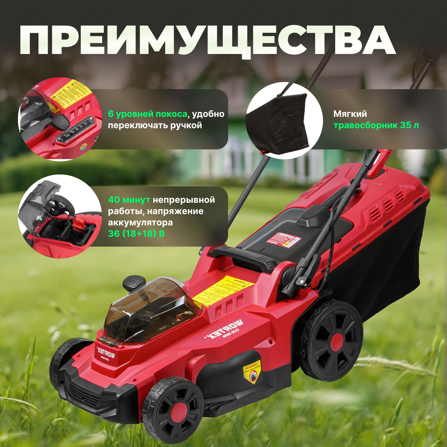Газонокосилка аккумуляторная WORTEX шир. 37 см., травосборник 35 л. интересное: