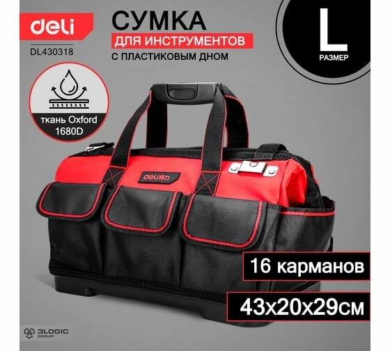 DELI Сумка для инструментов с жестким пластиковым дном DL430318 430x200x290мм (16 карманов, плечевой ремень, ткань оксфорд 1680d) 111106