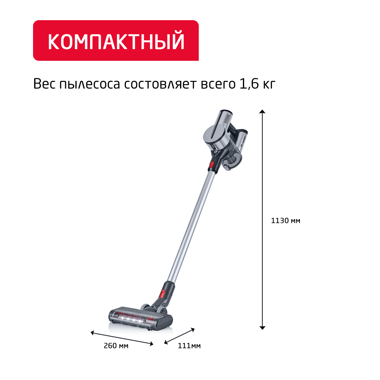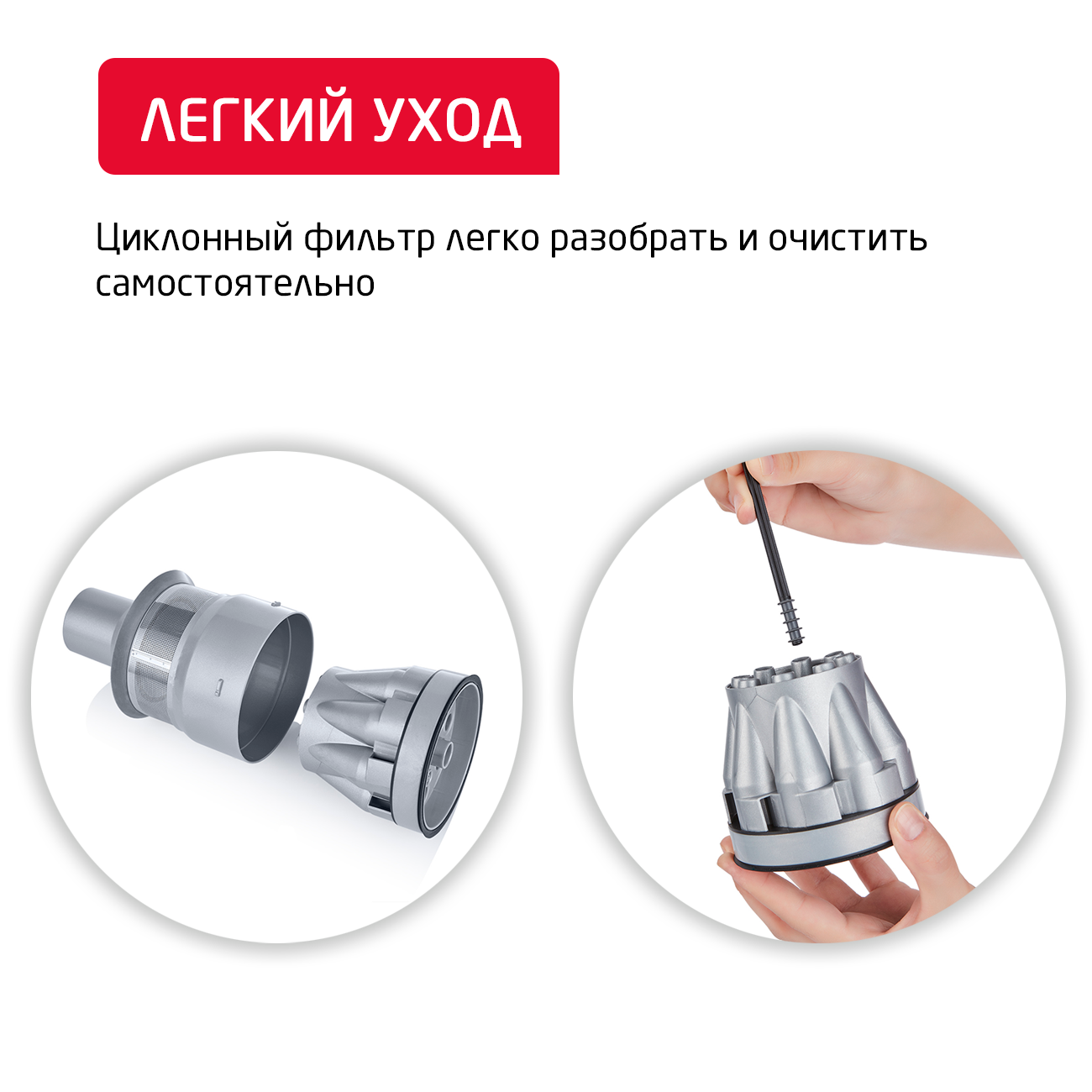 | Особенности конструкции | вертикальная парковка / индикатор заполнения пылесборника / место для хранения насадок / регулятор мощности на корпусе / управление мощностью на рукоятке |