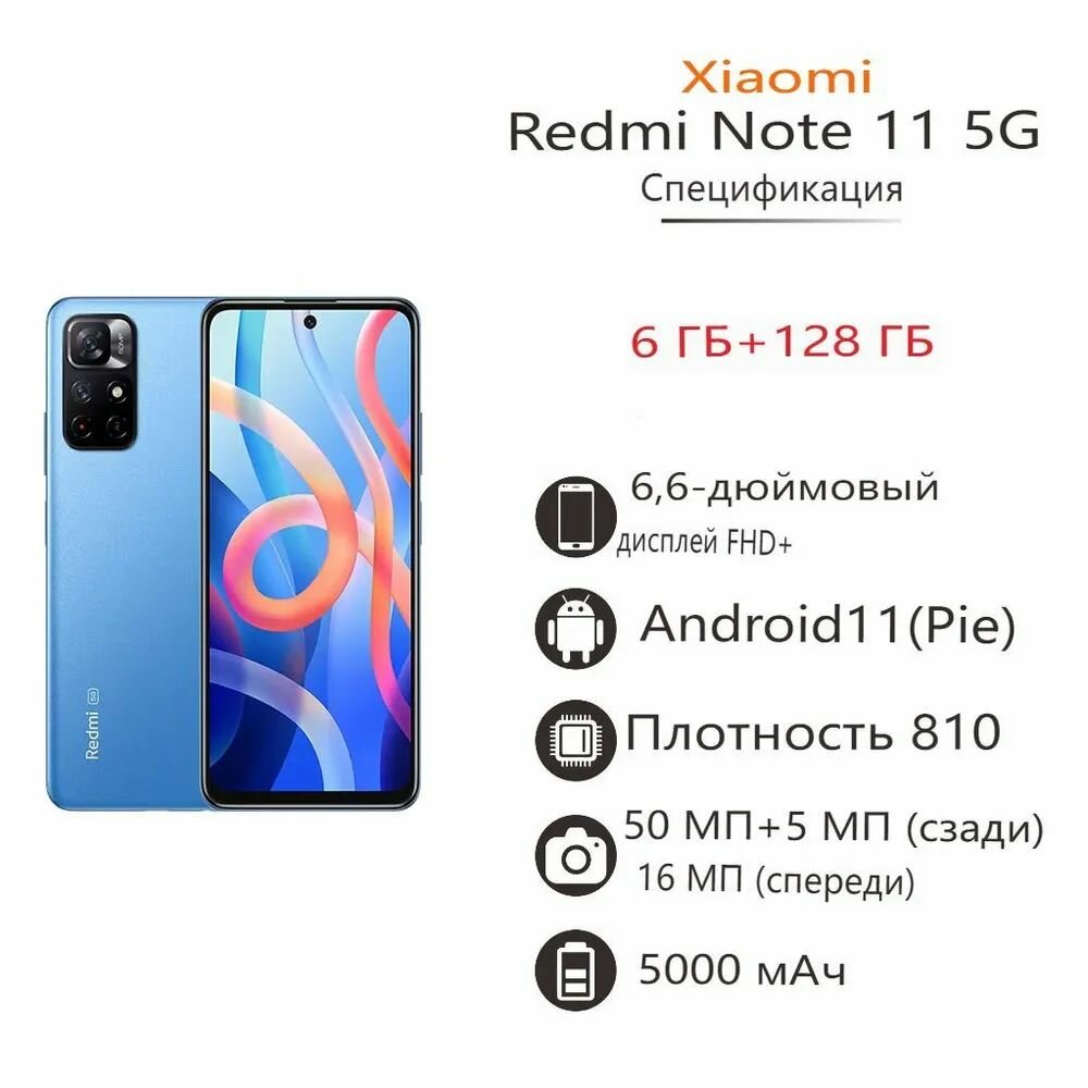 Смартфон Xiaomi Redmi Note11, 6/128, синий Версия процессора 810 Быстрая зарядка Mach 5000 Высокая мощность