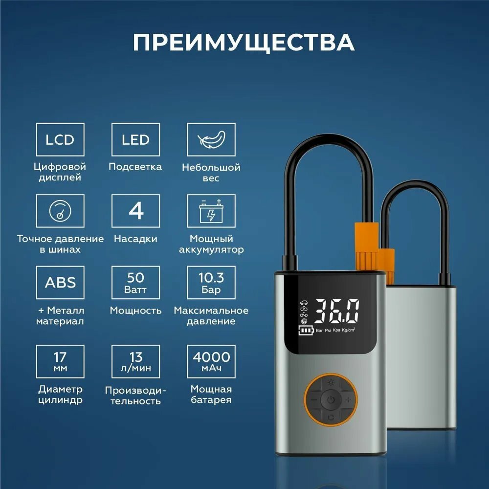 | Подробная комплектация | Автокомпрессор, Насадки, Зарядный кабель, Инструкция на русском, Упаковка |