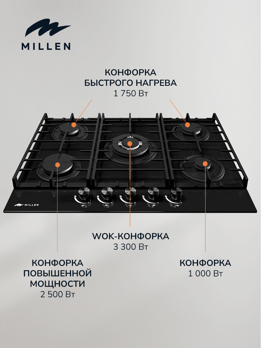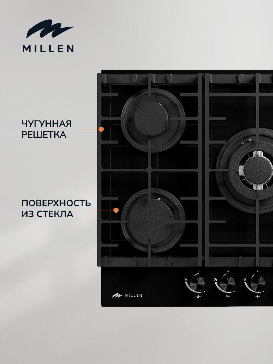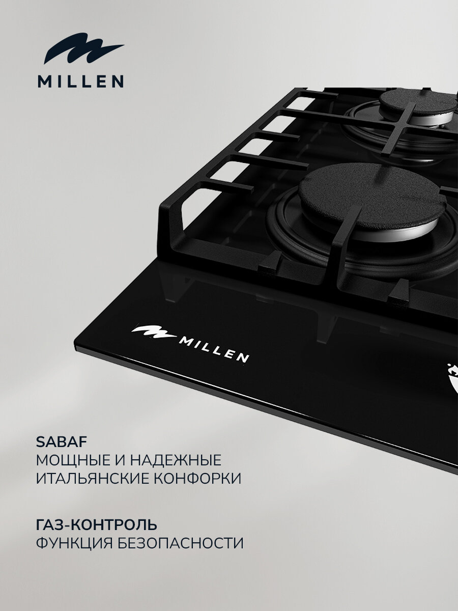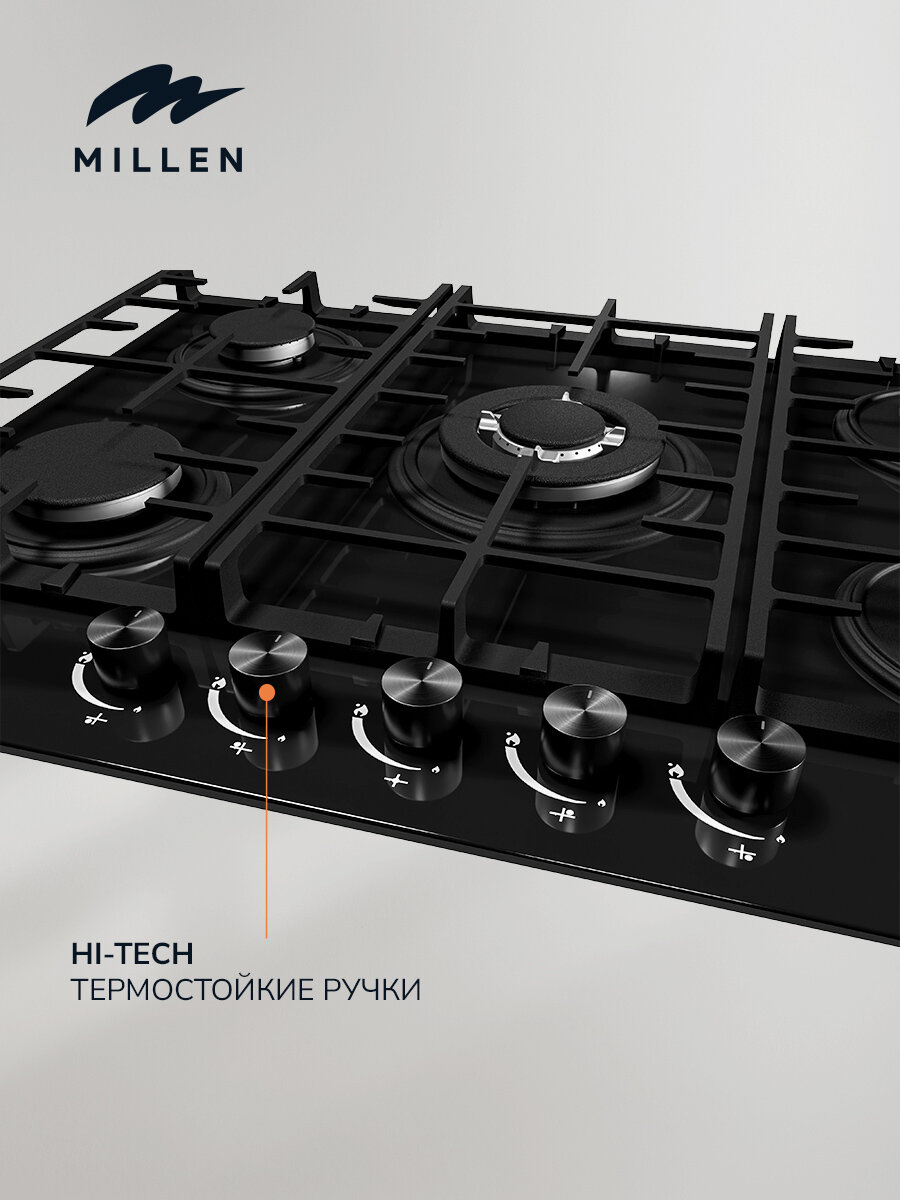 Варочная панель встраиваемая газовая MILLEN MGHG 701 BL, черный, ширина 70 см, 5 конфорок, материал поверхности: стекло, материал решёток: чугун, электроподжиг, газ-контроль интересное: