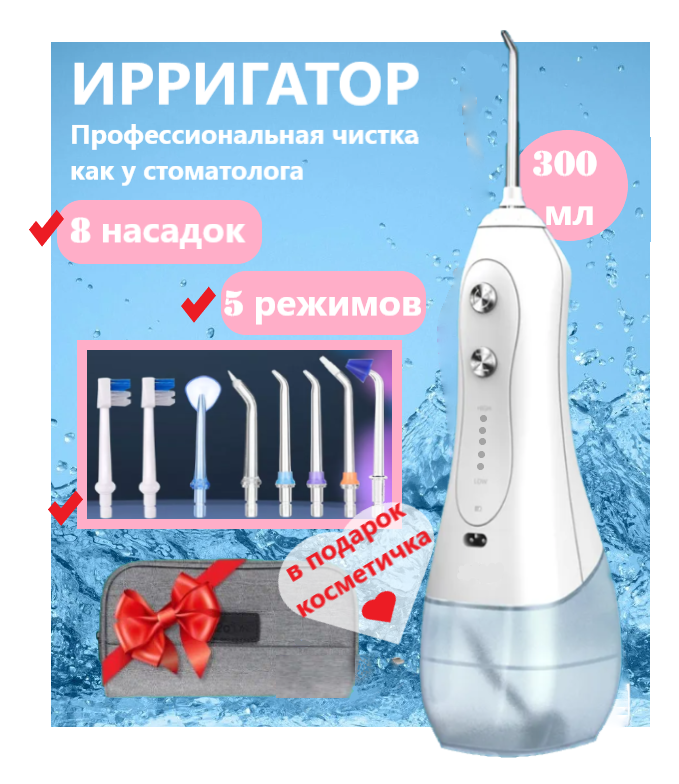 Беспроводной ирригатор White 8 насадок/ 5 режимов и 5 уровней мощности + косметичка в подарок интересное:
